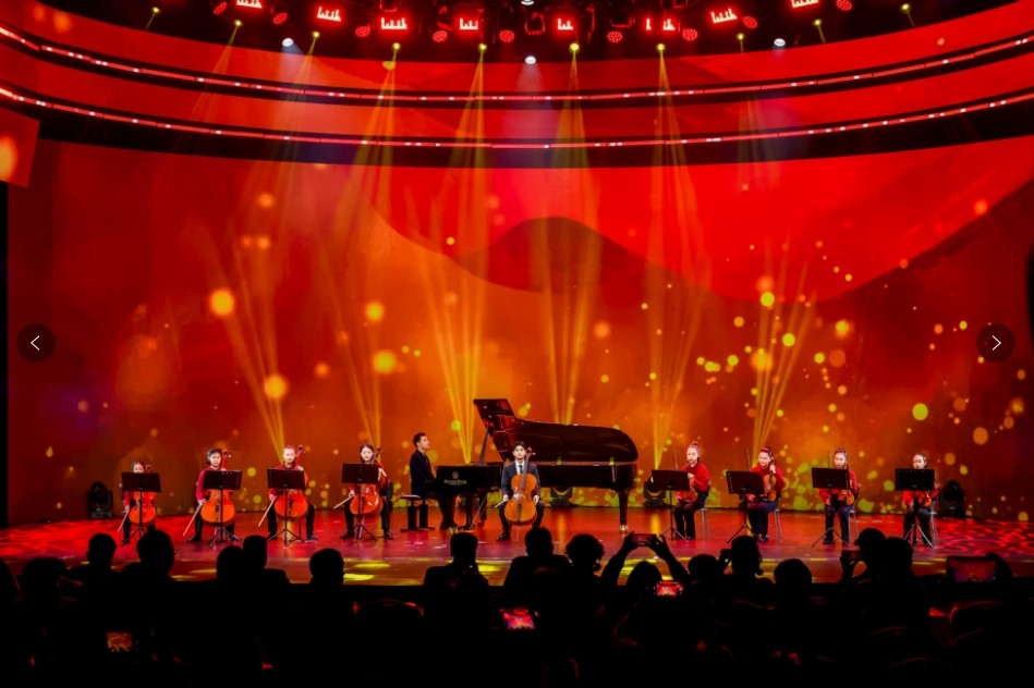 录制现场,传统纹样与现代科技交融的舞台搭配星河般炫酷灯光,打造沉浸式观赏体验。国际钢琴家汪洋与大提琴演奏家赵宰亨的跨界合作拉开序幕,《赛马+云宫迅音》《我爱你中国》的演绎中,钢琴灵动与大提琴深沉交织,中西乐器碰撞出震撼火花。歌唱家韩磊以雄浑嗓音唱响《好儿郎》,“少年自有少年狂,敢与天地试锋芒”的歌词,精准契合马年“驰骋奋进”精神,激励少年追梦。