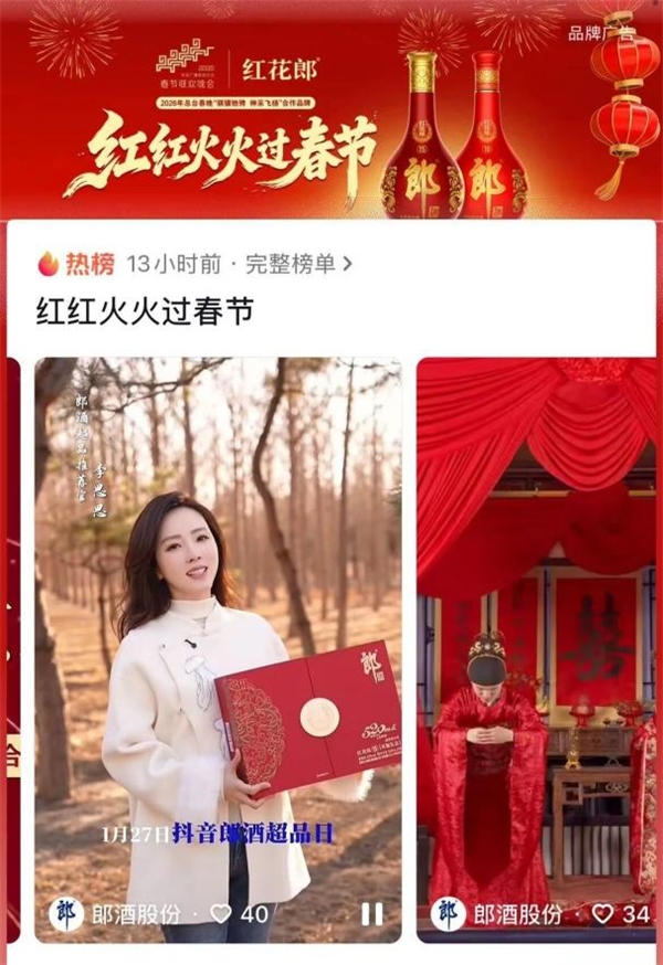#红红火火过春节#话题再登微博热搜榜;一部红花郎《时辰里的中国红》贺岁微电影引起众多网友共鸣;#红红火火过春节#抖音全国挑战赛全民任务话题播放量突破近10亿人次……从渠道供货价稳步上调到再度成为2026总台春晚合作品牌,再到以全民互动激活消费热情,红花郎这波春节营销组合拳,让“红红火火红花郎”彻底印刻在消费者的脑海之中。