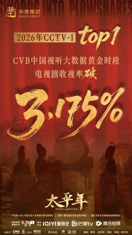 “看《太平年》需要拉进度条,往回拉的那种。”“追《太平年》,你最喜欢剧中的谁?你的IP在五代十国的哪里?”“入了《太平年》的坑,一边看剧一边查史,太上头了,愿为九郎君效死”……2026年开年,由华策集团出品的历史巨制《太平年》在央视一套、爱奇艺、芒果TV、腾讯视频火爆热播,截至目前,CVB收视率破3.175%、全网热搜超1482个、全网累计有效播放量超6.97亿,爱奇艺站内热度超7500、腾讯视频站内热度24393,微博、抖音、小红书主话题阅读量超38亿,掀起全民追剧、全民学史的热潮。