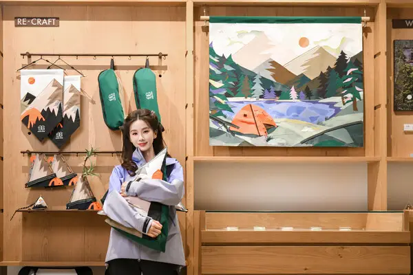 作为可持续理念的具象实践,店内设置「RE-CRAFT纤循再造区」,清晰展示旧衣回收再生全链路。顾客通过店内扫码或可隆官方小程序预约参与,经核验确认后即可获得会员积分、专属环保身份标识,并解锁KOLONCOFFEE赠饮券及限定再生面料礼品——「靠山山灵」抱枕及月亮椅兑换资格,让可持续行动融入可触可感的日常。