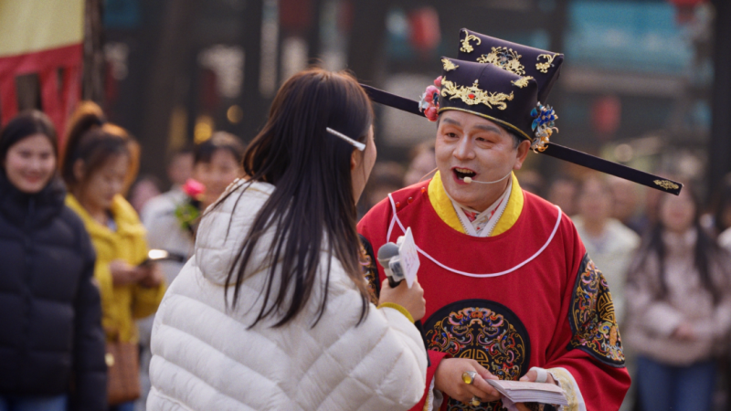 身穿花棉袄的“老嫂子”即兴起舞,动作自带节奏,引得众人加入;巡游的“财神”被团团围住,忙着送祝福、合影。这些鲜活的场景,正是其走红的缩影。