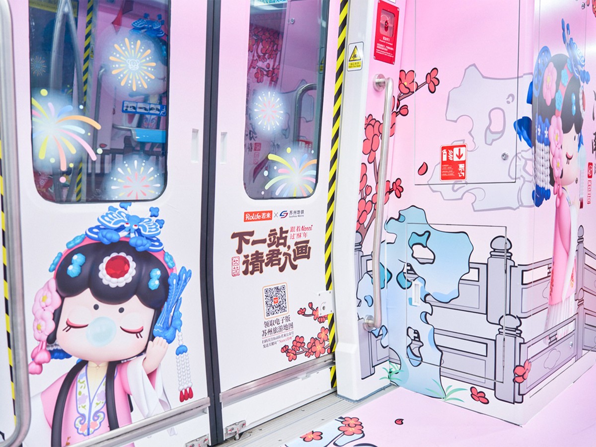 近日,Rolife若来携旗下原创IP形象——苏州囡囡 Nanci,与苏州地铁共同打造新春主题活动“下一站,请君入画”,相关主题内容已在地铁空间陆续呈现。通过主题车厢与特色站点的布置,苏州园林意象与传统年俗元素被引入城市通勤场景,在日常出行空间中勾勒出具有苏式韵味的新春画面。