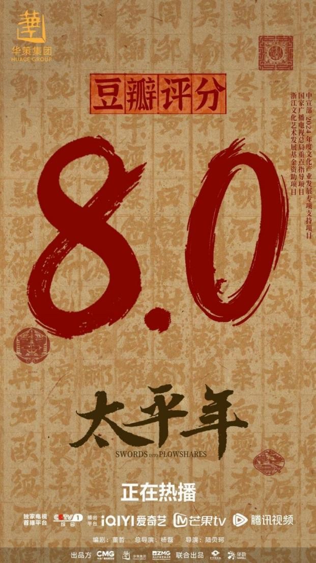 华策集团出品的历史巨制《太平年》1月23日在央视一套黄金档、爱奇艺、芒果TV、腾讯视频首播,收视一路领跑,热度屡创新高。截至目前,CVB收视率破3.175%、爱奇艺站内热度破7500、腾讯视频站内热度破24500、芒果TV热播霸榜、剧集全网累计有效播放量超9.81亿,斩获全网热搜1600余个,微博、抖音、小红书主话题阅读量48.8亿,豆瓣评分8.0,真正实现“台网双爆”,强势掀起全民追剧、全民学史的热潮。同时,《太平年》国际发行覆盖全球73个国家和地区,首发联合超过12家国际主流平台。YouTube总曝光量超1000万,并荣登越南头部流媒体平台TV360“热门剧集榜”海外剧集TOP1,北美主流流媒体平台Viki评分9.3,实现了“国内国际热度齐飞”,带动海外观众了解中国历史与文化脉络。