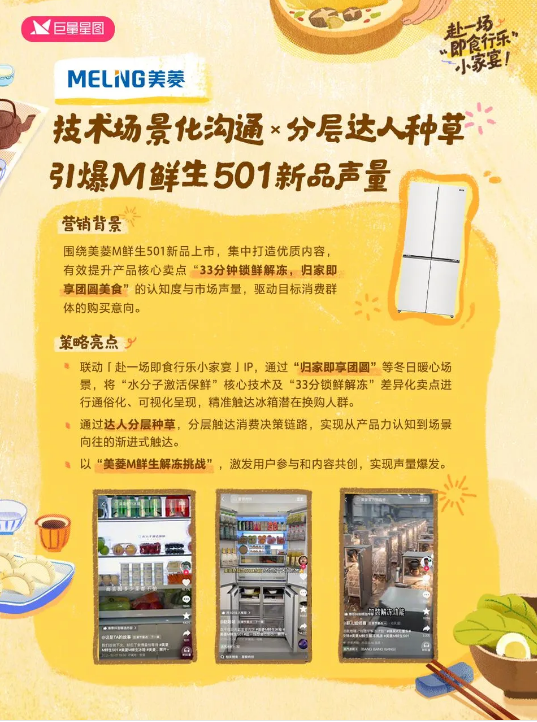 美菱则精准锁定“鲜”机,以科技解冻团圆时刻。紧扣“归家即享团圆美食”的冬日核心痛点,将复杂的“全空间水分子激活保鲜技术”转化为对家庭团圆、食材本鲜的温情守护。