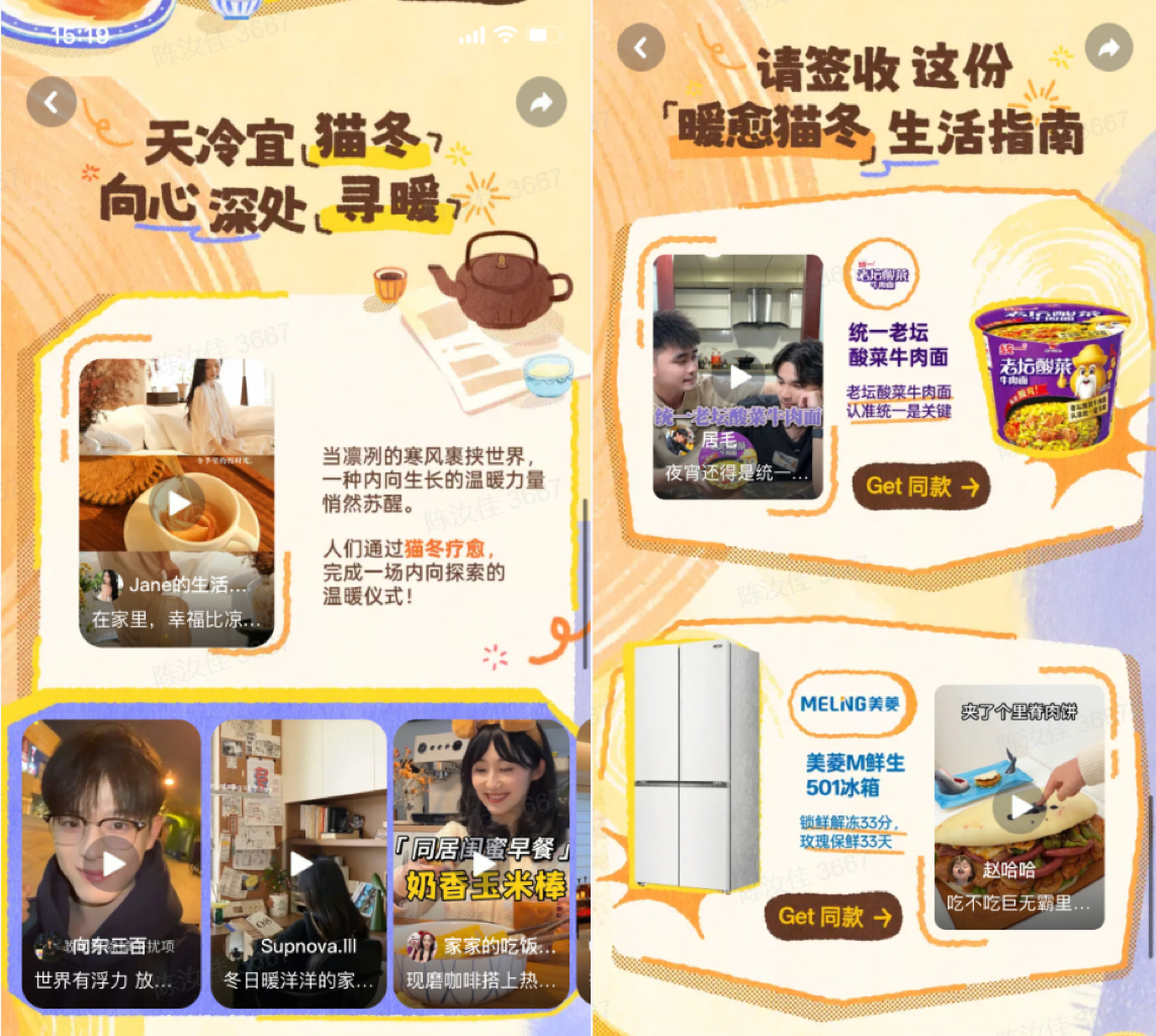 活动期间, 「赴一场即食行乐小家宴」上线「暖愈猫冬趋势图鉴」 ,系统性输出冬日生活灵感的同时,为品牌构建专属的 “暖愈猫冬生活指南”品牌专区,不仅巧妙串联起品牌和产品信息,让用户种草,所见即所得,而且进一步拉近品牌与消费者的距离,提升用户的购物体验。