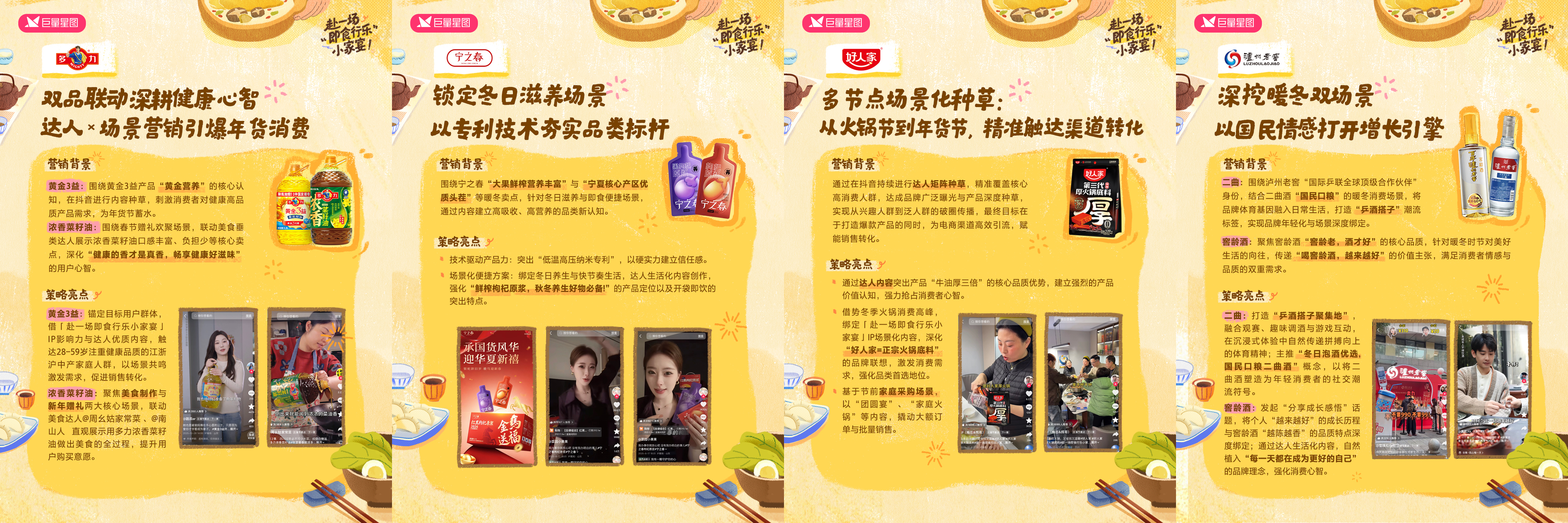 依托巨量星图「赴一场即食行乐小家宴」第二季IP,众多优质品牌各展所长,共同丰富冬日“好好吃饭”的生活内涵,以场景化的种草模式打造出品牌爆款,完成品牌场景和口碑打造,既让产品优势在沉浸式体验中无形的传递,高效地驱动海量用户消费决策,又能够更大范围覆盖到精准用户,助力品牌“破圈”营销。