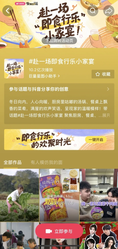 自活动上线以来,IP话题#赴一场即食行乐小家宴 迅速引发了广泛共鸣,吸引了众多用户点赞分享,截至目前已收获超10.2亿播放量,成功地将品牌对“暖”的理解,转化为一场全民参与的情感叙事,让品牌价值在最具烟火气的日常场景中自然沉淀,实现产品的大范围“种草”。