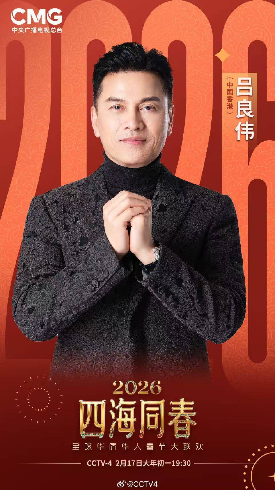 2026年2月17日(大年初一)19:30,中央广播电视总台华语环球节目中心打造的《2026年“四海同春”全球华侨华人春节大联欢》将登陆CCTV-4中文国际频道。这场以“同心贺岁,四海迎春”为主题的“云端家宴”,承载着全球华侨华人的家国情怀,也迎来了吕良伟在主持领域的首次亮相。