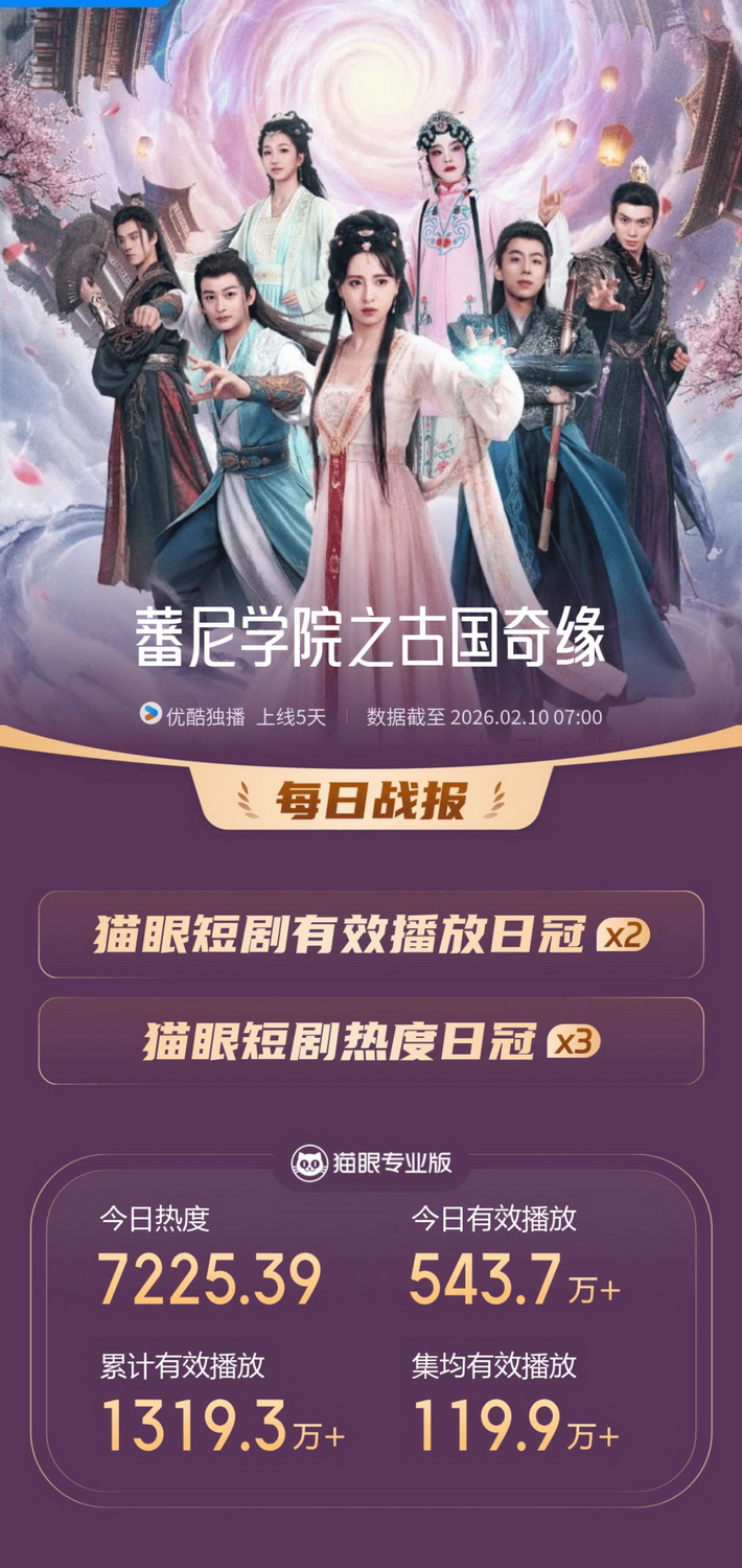 更值得一提的是,该剧上线后迅速登顶猫眼短剧有效播放日榜与短剧热度日榜,强势拿下猫眼有效播放周榜TOP1,其中单日热度最高达7225.39。粉丝留言称“悦儿郡主的古装造型太戳了”“短剧质量真的高”,显示出该IP在青少年中的强大号召力。