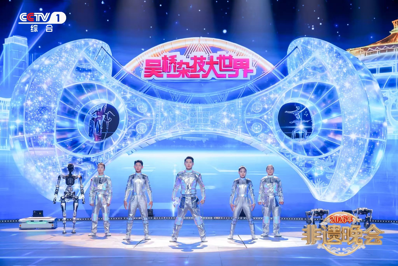 AR、AI、VR、机械臂、智能机器人等现代科技与非遗技艺深度结合,打造出兼具温度与科技感的舞台奇观。《通关·技》中,人形机器人与非遗传承人抛接抖空竹惊艳亮相,还有机器狗、AMR机器人,一场非遗与科技的碰撞、力量与平衡的极限挑战轮番上演,展现传统杂技技艺的力量与平衡之美,诠释千年杂技技艺的新潮魅力。
