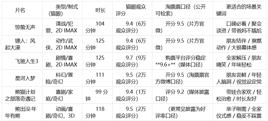下面这张表,按“春节档实际决策”最常用的维度来排:类型 / 时长 / 猫眼观众评分 / 淘票票口径(能检索到则写)。