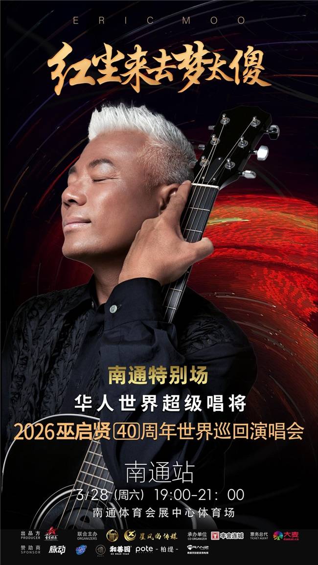 华语乐坛实力唱将巫启贤,携出道40周年特别企划巡演登陆南通。《红尘来去梦太傻》巫启贤40周年巡回演唱会·南通站正式定档2026年3月28日(周六)19:00,于南通体育会展中心体育场唱响经典,与全城歌迷共赴一场跨越时光的音乐之约。