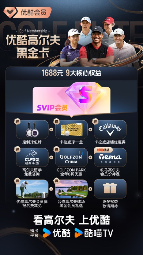 其中与多家业内知名品牌联名推出的“优酷高尔夫黑金卡”,整合优酷SVIP年卡会员、高尔夫尊运动公园打球八折优惠、2500元卡拉威天猫旗舰店优惠券、优酷高尔夫会员赛报名费减免、合作高尔夫球场黑金礼遇等八大权益,覆盖球友观赛、学球、练球、下场、装备入手等高尔夫生活的各个环节。线下会员邀请赛联动国内锦标赛级别高尔夫球场,带给会员顶级的线下打球体验,优酷体育由此开拓出从线上内容延伸到线下体验、从竞技欣赏延伸到个人实战的高尔夫受众互动空间,介入到高尔夫生态圈更深入的圈层,加强了对于活跃国内高球社区的贡献。