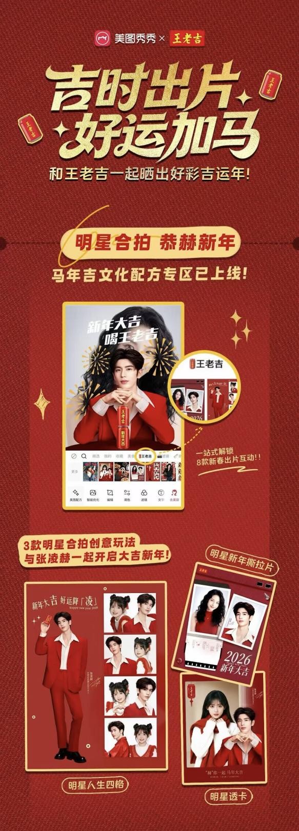 本次合作中,美图公司旗下美图秀秀、美颜相机等平台围绕王老吉品牌代言人张凌赫,打造了矩阵式的明星合拍玩法,让用户体验与偶像数字分身的线上深度互动。“AI人生四格”让用户上传单人照即可解锁与张凌赫的甜蜜四连拍,“AI撕拉片”一键生成复古胶片感定格吉运瞬间,“新年大吉透卡”则以梦幻特效让新年出片自带高光,全方位满足粉丝追星与出片需求。同时,美图在端内上线张凌赫3D破框开屏与首页沉浸焦点视窗,引爆粉丝圈层参与热情,让粉丝在互动中深度感受吉文化氛围。