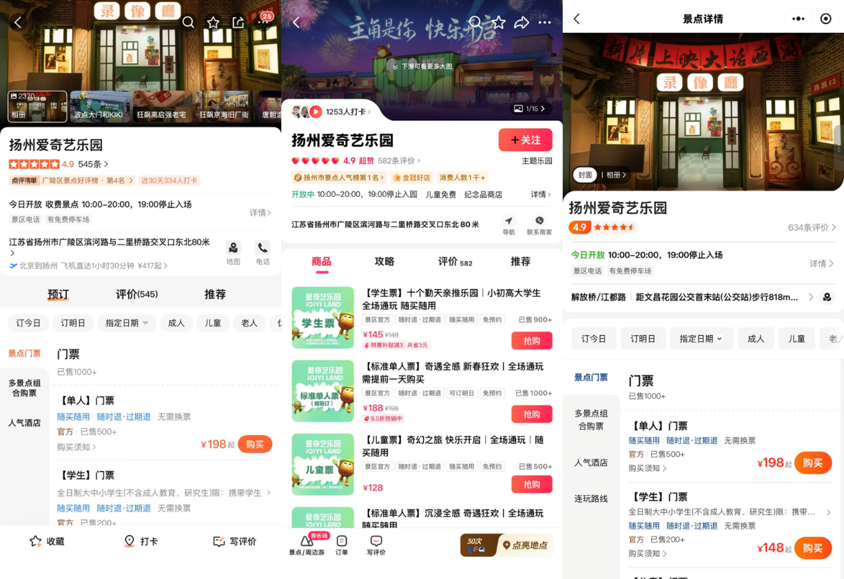 作为爱奇艺全球首家线下乐园,扬州爱奇艺乐园实现了“全龄同乐”,从四五岁孩童到六七十岁长者,均能参与项目体验。乐园收入主要来自门票及二次消费品。与传统室外大型主题乐园不同,爱奇艺乐园采用轻资产模式运营,借助AI、XR等前沿技术深度开发影视IP,为游客打造更具互动感和沉浸感的线下娱乐体验。园内囊括《狂飙》《唐朝诡事录》《莲花楼》《大话西游》等多个热门IP,核心体验项目涵盖沉浸舞台演艺、全感剧场、光影互动空间、角色即兴互动等七大板块,并设有众多影视名场面打卡点。根据抖音、携程、美团、大众点评等平台上的评分,扬州爱奇艺乐园评分均超4.8分,用户反响热烈,口碑持续攀升。