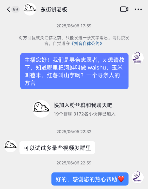 与此同时,他再次打开与抖音方言达人“东街饼老板”的对话窗口。“饼老板”精通的并不是某一地方言,而是擅长通过发音规律判断方言片区。早在半年多前,金建就曾联系过他,希望他通过受助人的语音锁定其家乡。但那几次,要么是受助者流浪太久乡音已淡,要么是口音混杂,最终没能锁定确切范围。
