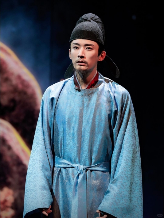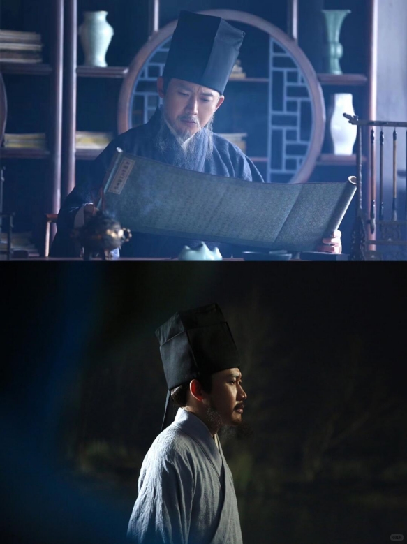 苏轼这套造型高度还原宋代文人风貌,细节尽显宋代美学与文人气质:上身着宋代典型的交领长衫,面料质感素雅古朴,色调沉稳内敛,头戴宋代士大夫常用的黑色方巾帽(东坡巾),生动塑造出苏轼作为文坛大家的儒雅、睿智与诗意感,将宋代文人的风骨与神韵具象化。