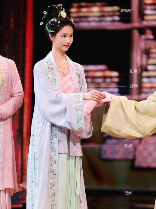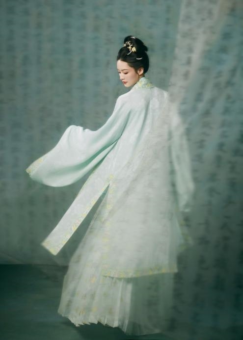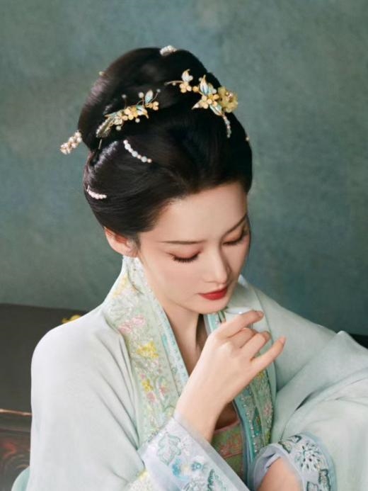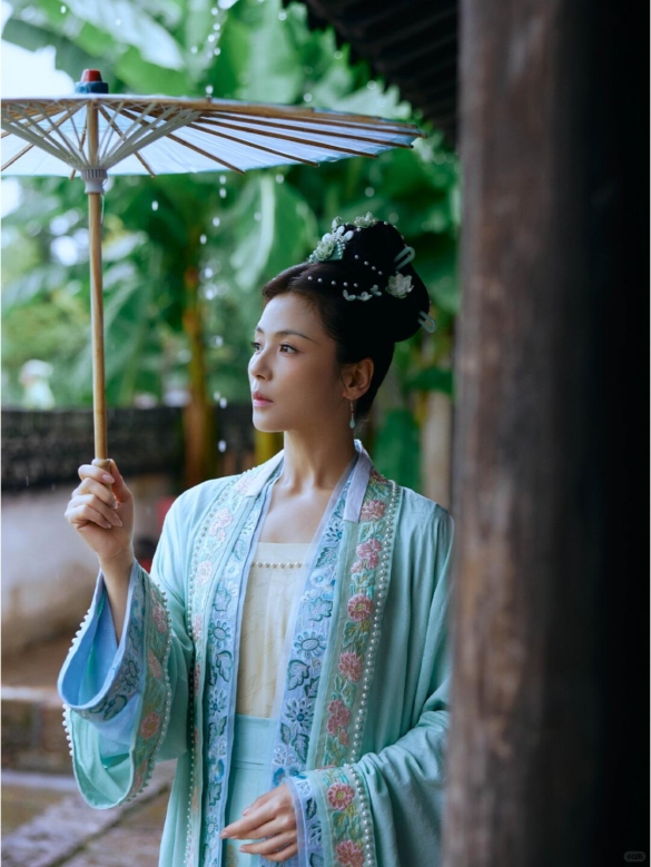 简直是教科书级别的宋制穿搭!这套造型摒弃了浓墨重彩,用水绿、鹅黄、嫩蓝等低饱和度的柔和色调,精准还原了宋代“清雅含蓄”的审美情趣。长褙子的款式强调了一种端庄的气度,把李清照的温婉贵气、果敢坚毅都融在了这一袭衣衫里。