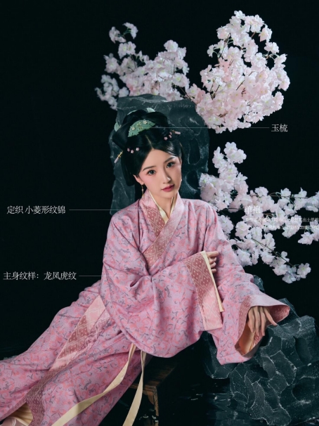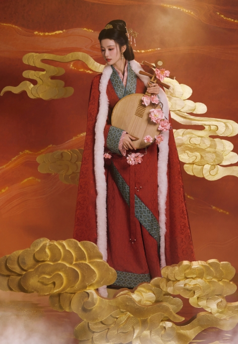 服装装饰着金色几何纹饰,仿佛将纷繁复杂的历史脉络都藏进了面料肌理里,低调中透着故事感。它不仅是一件华服,更是一段可穿戴的历史,只一眼,便能看到在春秋乱世中,独立于桃花树下,美而不语的传奇女子。