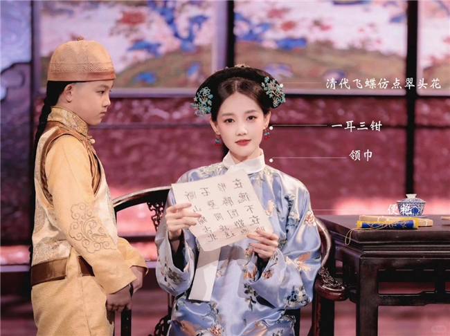 李一桐这套清代旗装造型是央视综艺《一馔千年》中富察氏的日常造型,以清代旗装为基底打造得极具考究感:发型采用清代经典的盘辫与如意头结合样式,燕尾形扁髻利落规整,而色彩艳丽、错彩交辉的飞蝶金头花(仿点翠工艺),更是为造型注入了清代贵族的典雅气质。