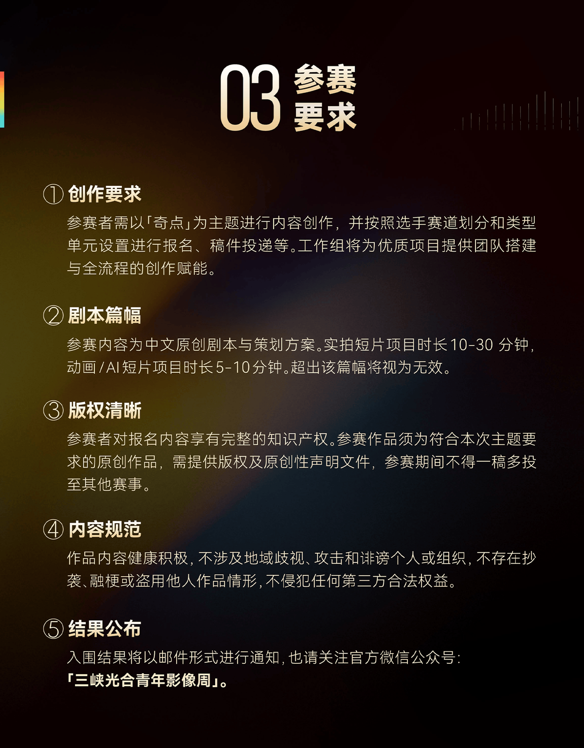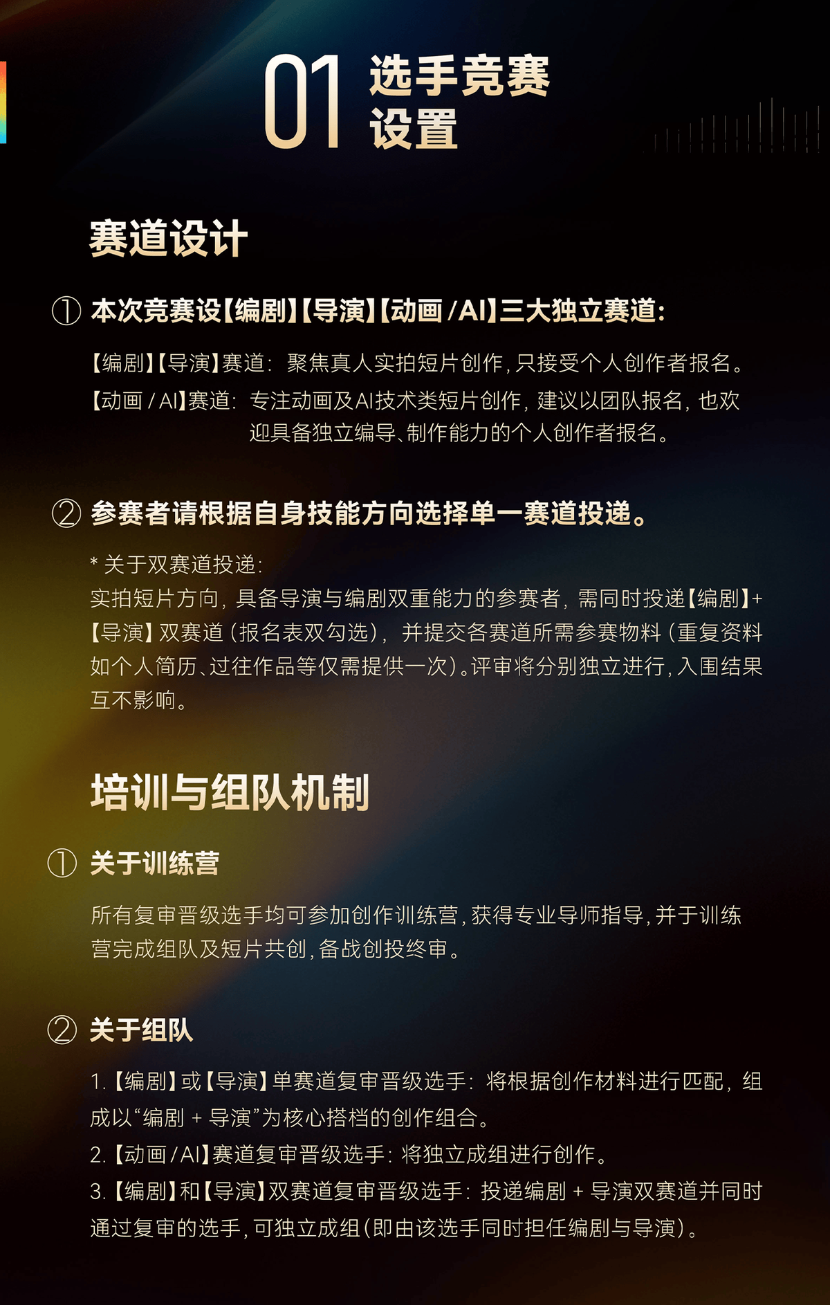 一是赛道区分,精准覆盖多元创作领域。 征集面向导演、编剧、AI创作者、动画人才等不同领域的青年创作者,设置相应的作品创作赛道与为各个赛道量身定制的评审标准。本届评选打破以往固定的条框限制,不再单纯依赖单一维度的硬性指标,而是以发现创作者的独特闪光点为核心导向——无论是深耕类型叙事的导演作品,还是探索技术边界的AI实验,亦或是充满想象力的动画短片,只要作品具备真诚表达与类型潜力,均可在各自赛道中获得专业评判与产业对接机会。赛制设计旨在让每一种创作才华都被看见,让每一位有潜力的创作者都能找到属于自己的表达舞台。