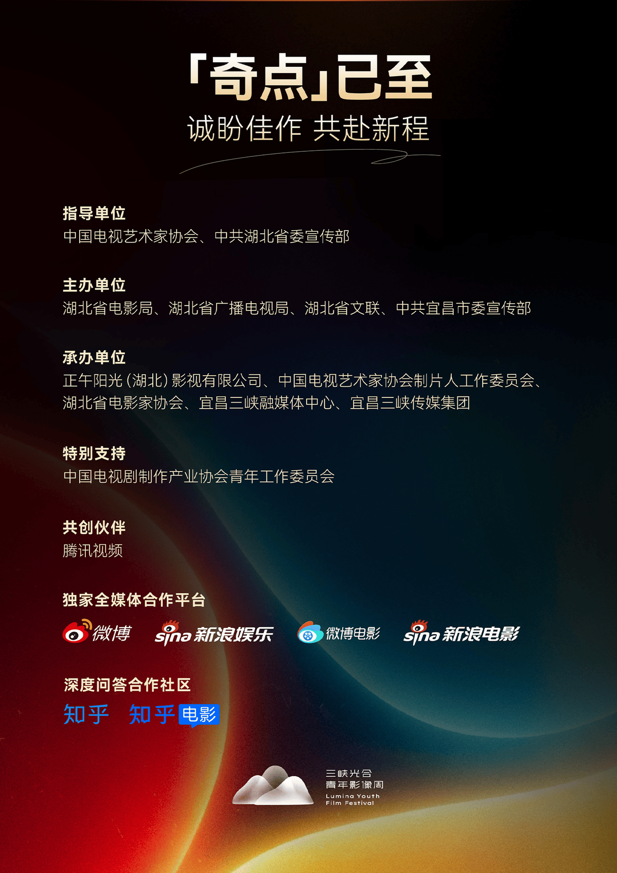 三峡光合青年影像周由中国电视艺术家协会、中共湖北省委宣传部担任指导单位,湖北省电影局、湖北省广播电视局、湖北省文联、中共宜昌市委宣传部共同主办,正午阳光(湖北)影视有限公司,携手中国电视艺术家协会制片人工作委员会、湖北省电影家协会、宜昌三峡融媒体中心、宜昌三峡传媒集团共同承办,中国电视剧制作产业协会青年工作委员会提供特别支持,腾讯视频将以共创伙伴的身份深度参与。此外,独家全媒体合作平台新浪微博,独家深度问答合作平台知乎,也将提供平台支持,助力影像周走向更远。