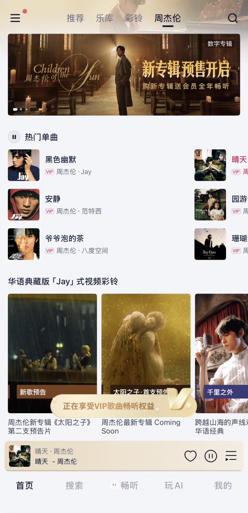 在咪咕音乐入手新专《太阳之子》,直接解锁两大超香福利:直接送价值158元的一整年天籁会员VIP,24bit至臻无损音质听歌特权直接拉满。一键设置周董新专MV同款视频彩铃,每次通话都变成周董专属舞台LIVE,打电话都舍不得挂。除此之外,周杰伦订阅号、APP主题皮肤、定制ICON、专属勋章等一大波粉丝专属权益,每一份惊喜都戳中杰迷。