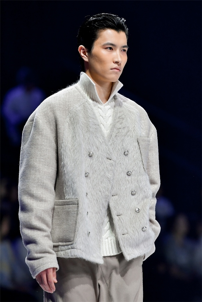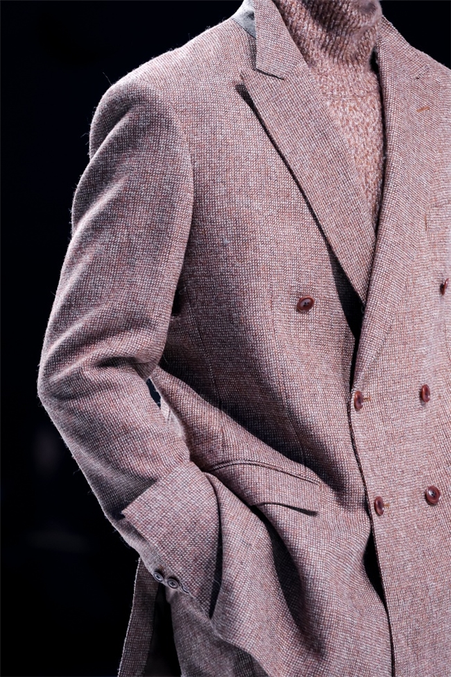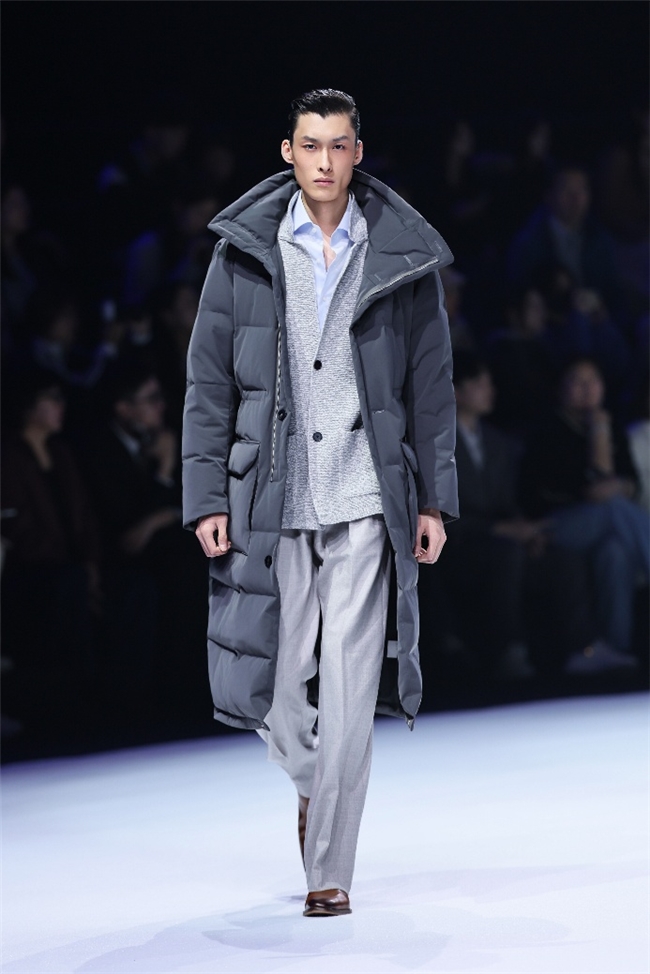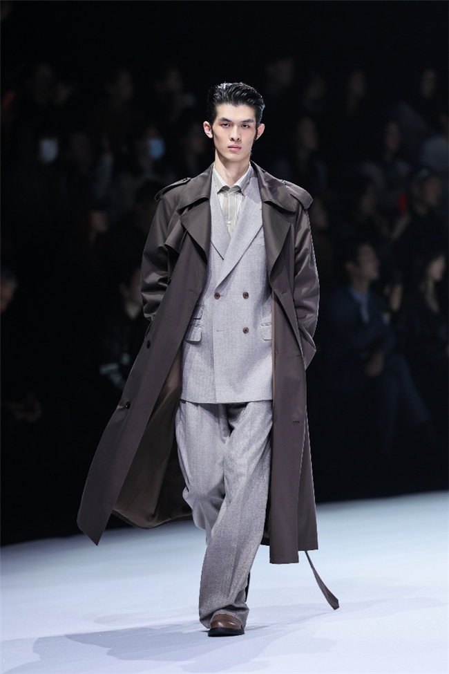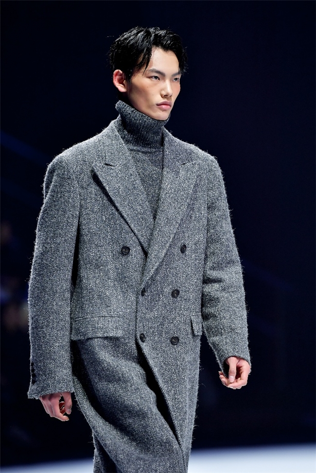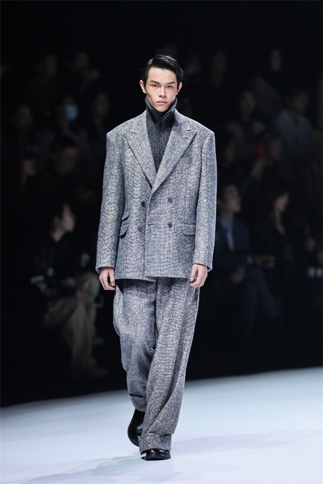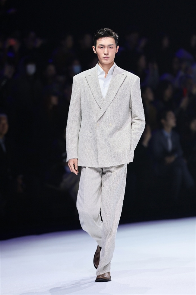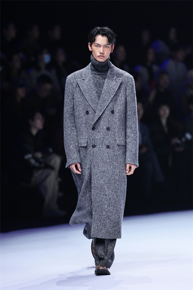 雕琢主题以珍贵耐用、低调高级的理念为精髓,将“长期主义”设计理念深植服装体系。设计在回归经典男装剪裁的基础上,精选高品质羊毛与科技面料,通过材质外观的微创新凸显巧思。服装色彩以沉稳高级的男装基础色系为主,通过素色、麻灰或微混色的质感表达,结合经典人字纹、格纹,演绎含蓄的奢华风貌。一系列套西、裤装等兼具实用性与品质感的单品,通过精巧花纱呈现的微妙肌理,展现现代精致感的同时,更以休闲的宽松版型契合商务、通勤等多场景适用的需求,完美满足当代精英对穿搭的更高期待。