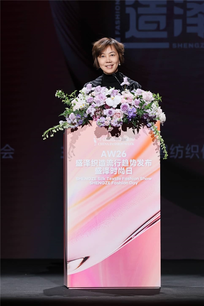 阎岩会长首先登台为活动致辞。她表示,盛泽今年在中国国际时装周再添春夏趋势发布,形成“秋冬+春夏”全季趋势体系,旨在以趋势引领、设计赋能打通面料研发与市场转化全链条,强化盛泽在全球纺织时尚领域的话语权。本次秀演汇聚盛泽本土优质面料企业成果,展现出“盛泽织造”区域品牌的力量。阎会长特别指出,2026年是“十五五”规划开局之年,盛泽作为“中国绸都”和全国纺织产业集群标杆,应以趋势为纲、设计为核、生态为基,抢占时尚话语权,锻造品牌竞争力,构建产业新优势。