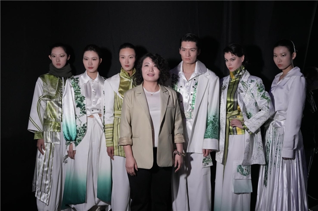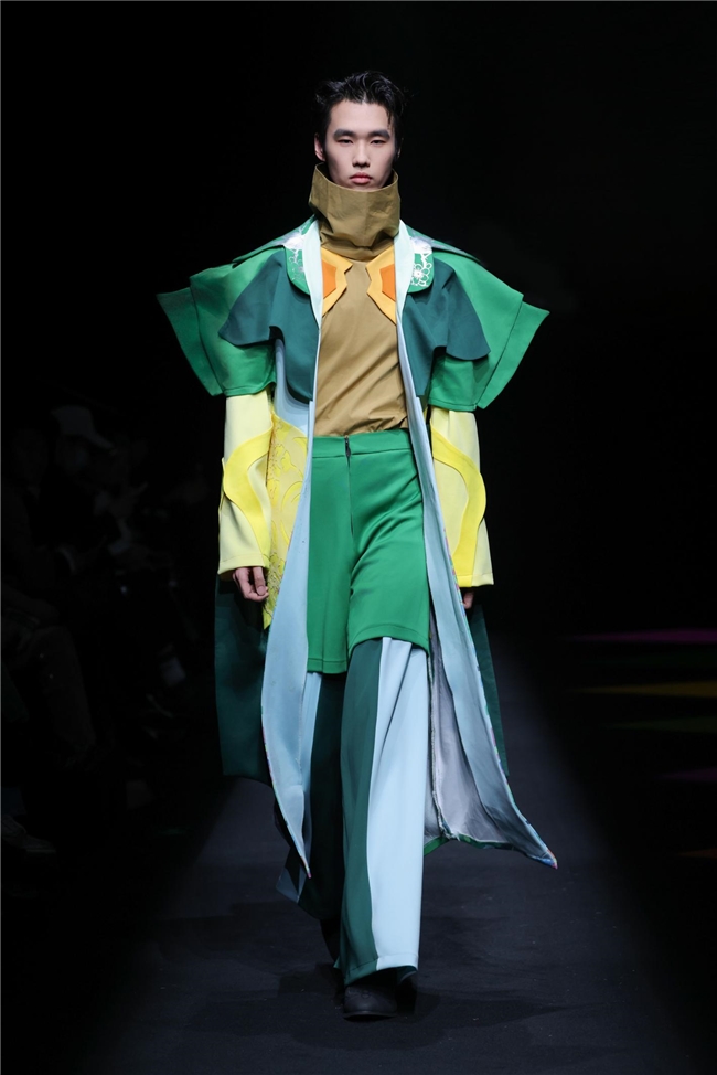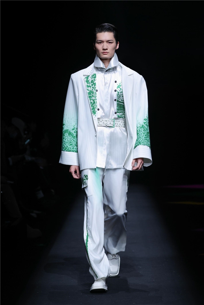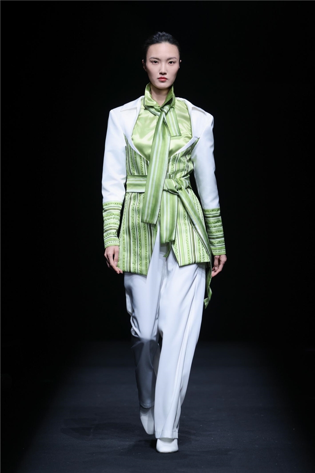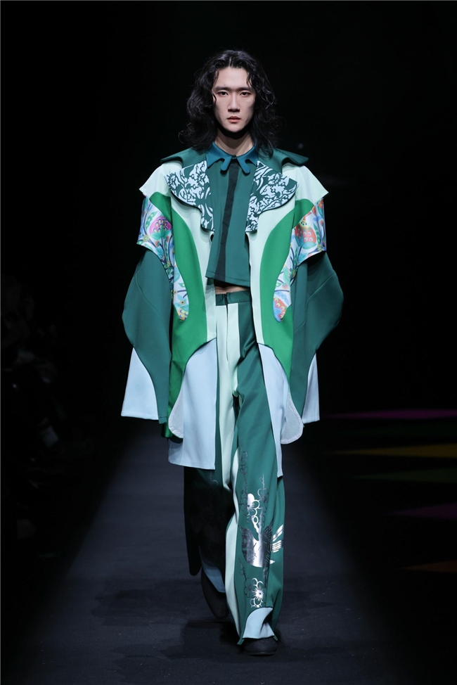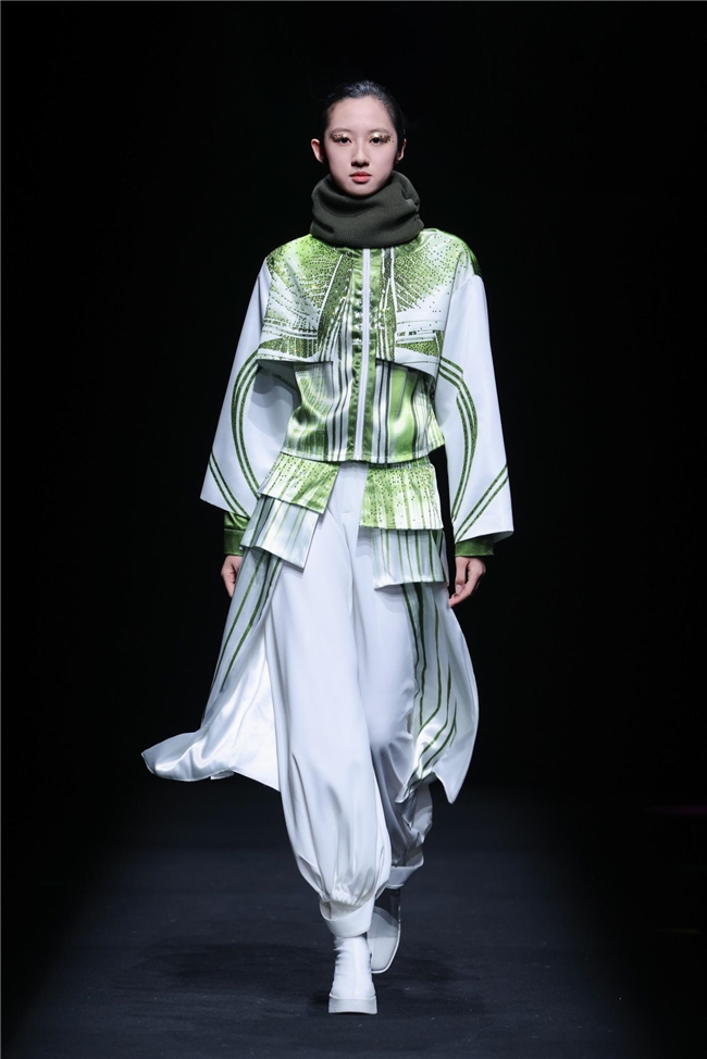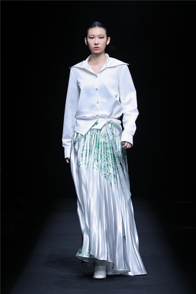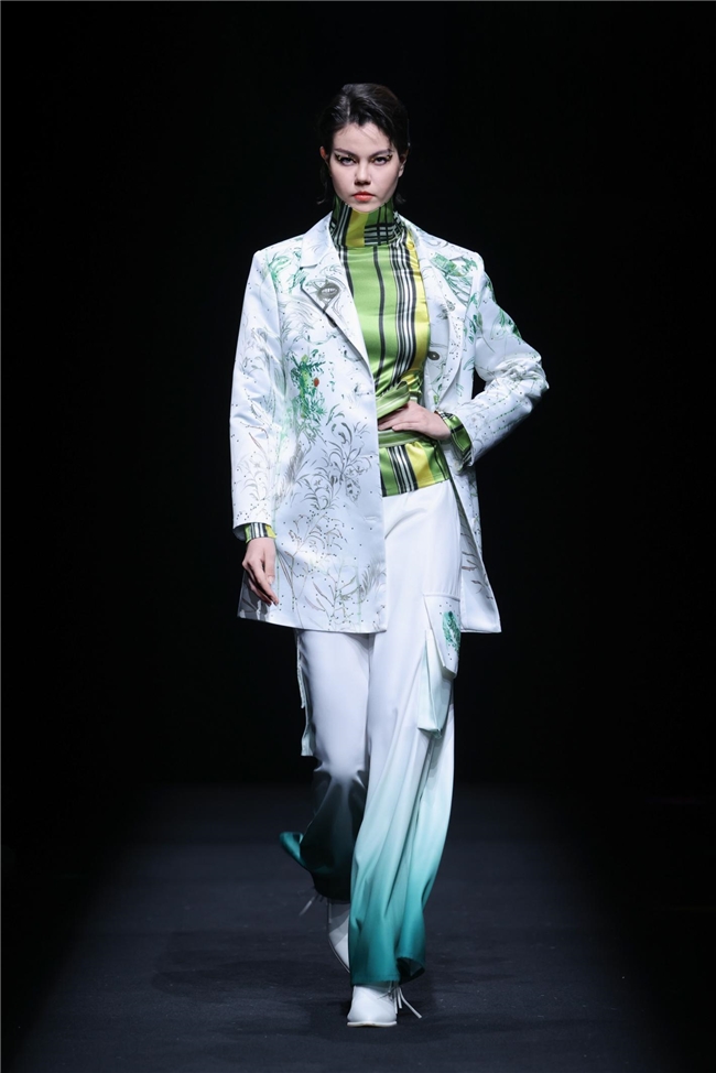 设计师王杨带来的《踏律而行》从春日草木的抽枝展叶、山水晕染的浓淡层次与清风拂过的摇曳姿态中汲取灵感,以“韵律”为核心逻辑,打破传统服装的静态束缚。该系列以白色为基底,将草绿、青绿由浅入深地晕染于衣摆、袖口、裤脚与局部图案之中,形成如晨雾、草木与水痕般的清润层次。设计上可见立体收腰、错位叠搭、不规则拼接、百褶裙摆、围裹式腰封与抽绳细节等处理,使服装在行走时更强调流动感与节奏感。与此同时,植物纹样与线性图案被穿插于上衣、外套和裙身表面,既强化了自然意象,也让整体造型在清雅之中保有视觉张力。