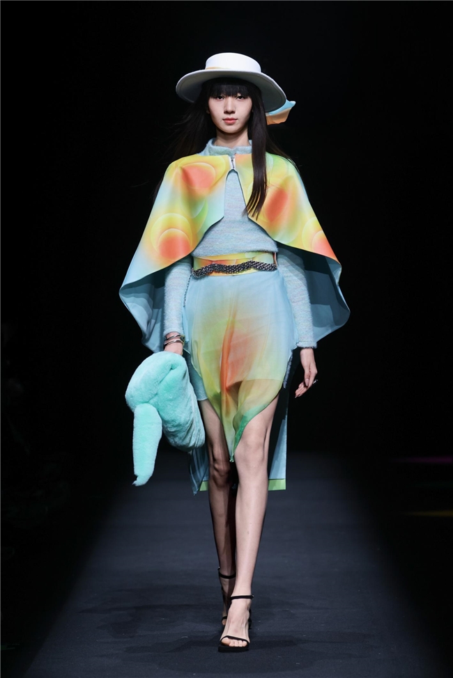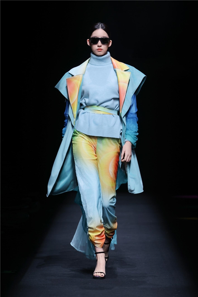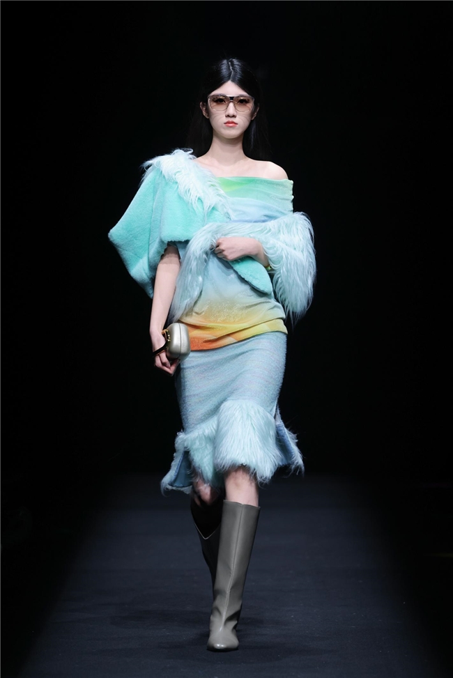 设计师王鑫的《元界光谱》从元宇宙与现实世界的边界融合切入,以“光谱”为线索串联虚拟与现实的视觉语言,探索科技与时尚的共生关系。该系列保留了真皮、裘皮等传统材质的工艺质感,同时借由数字光影、渐变色谱与未来轮廓重构其既有印象。既有带包裹感的短款造型,也有更具张力的露腰设计、披肩式处理和层叠搭配,使服装在身体关系上呈现出更强的雕塑感。色彩处理上,橙黄被转化为霓虹暖光般的高饱和色泽,带有虚拟界面的发光感;橘与绿则通过低到高的渐变过渡,模拟数字光谱的层次变化,使整组作品呈现出介于现实材质与未来视觉之间的张力。