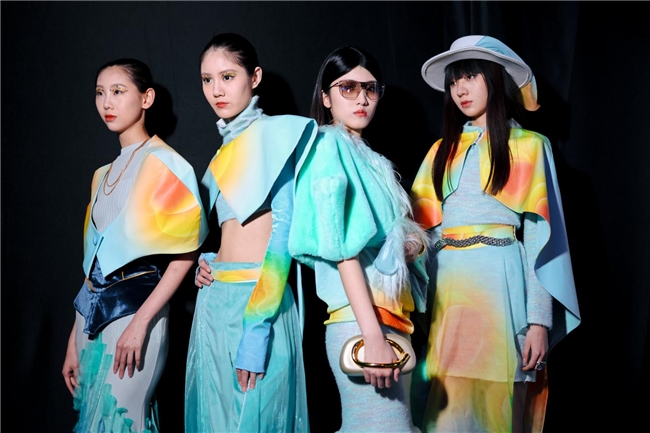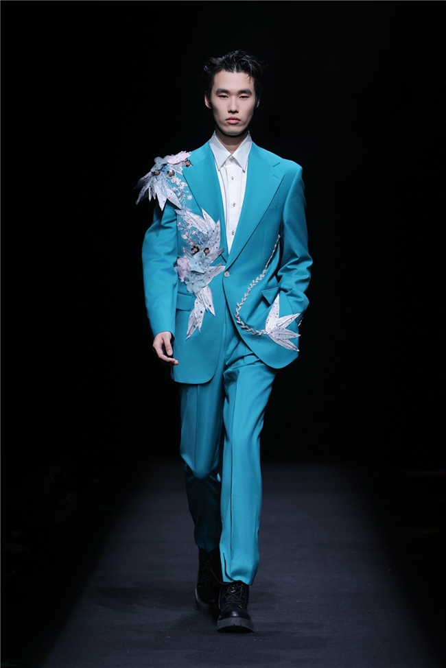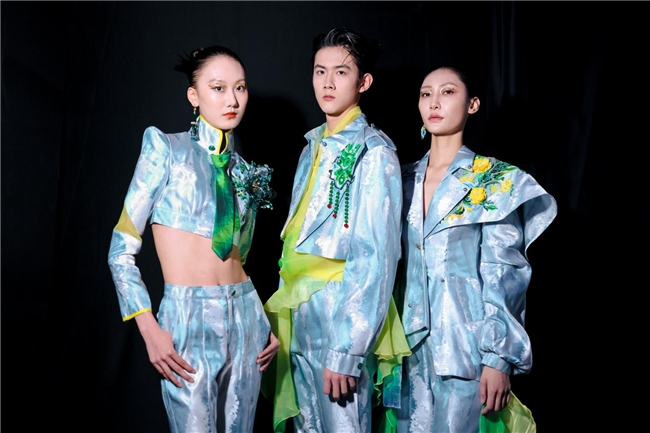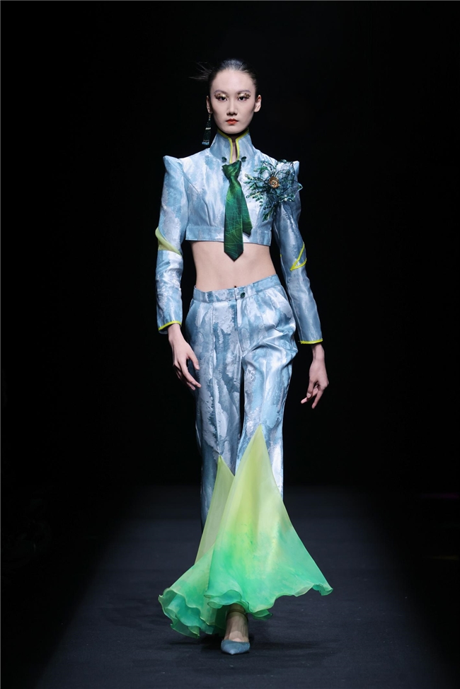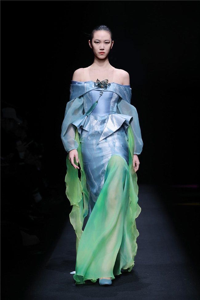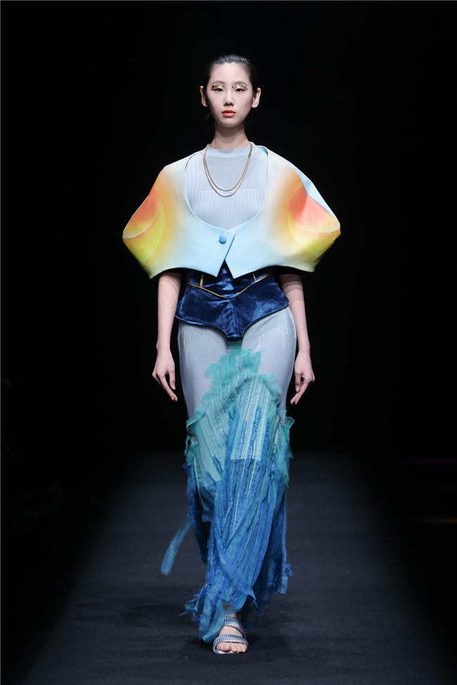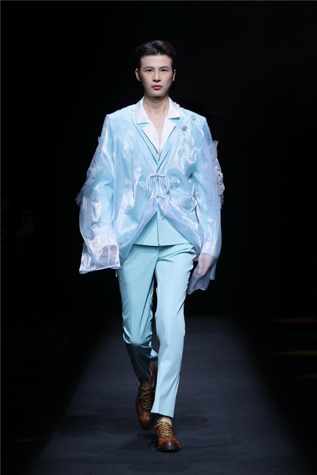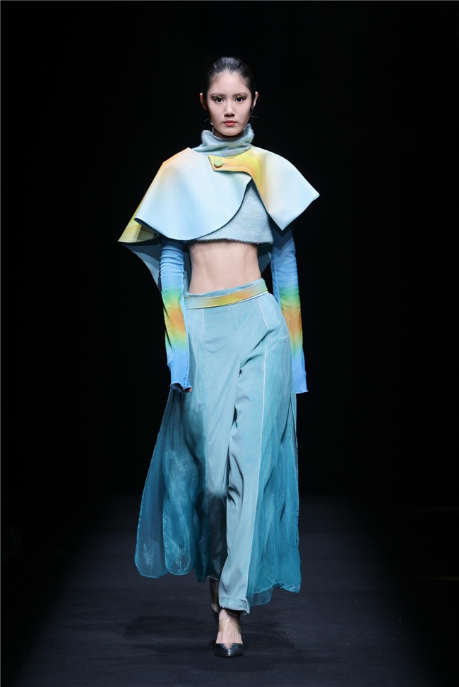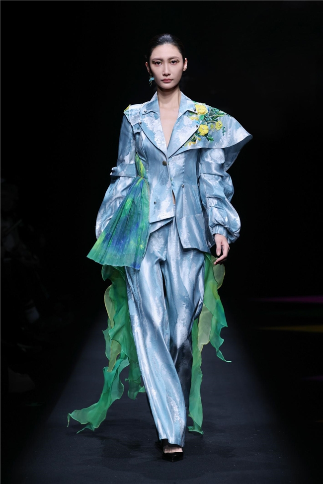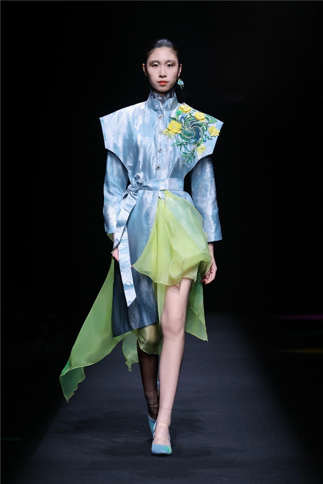 设计师于鑫的《碧波·翠影》以东方美学为核心,从点翠元素中提炼纹样与色彩精髓,在现代时装语言中完成轻盈转译。该系列中,设计师以天水碧作为主色调,整体气质清雅温润,同时以明黄、空青和黄绿渐变作为局部点缀:短款立体外套、露肩礼服、修身长裙与宽松长外搭彼此交替,既有利落感,也保留了柔和的女性气质;局部通过披覆式袖型、垂坠下摆和带有轻盈感的飘带处理,让服装在行走时呈现出流动的层次。色彩在这组不是直接并列,而是以蓝、黄、绿之间的渐变关系,构成含蓄而通透的东方意境。整组作品既有非遗工艺的细腻底色,也具备进入当代日常穿着的轻松状态。