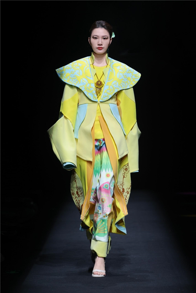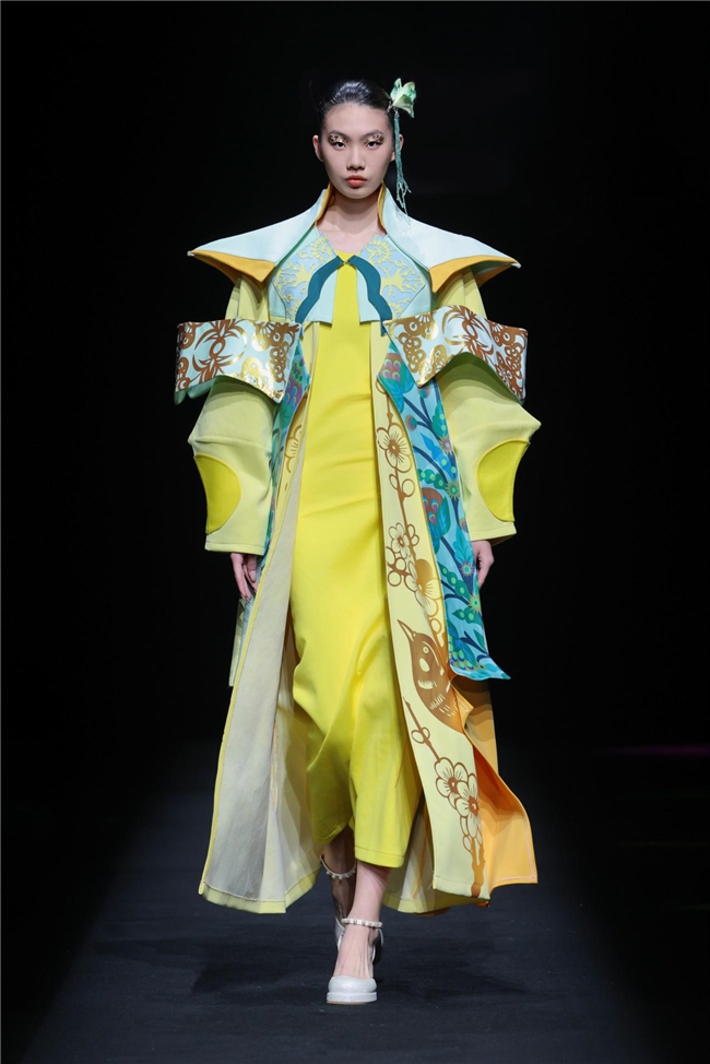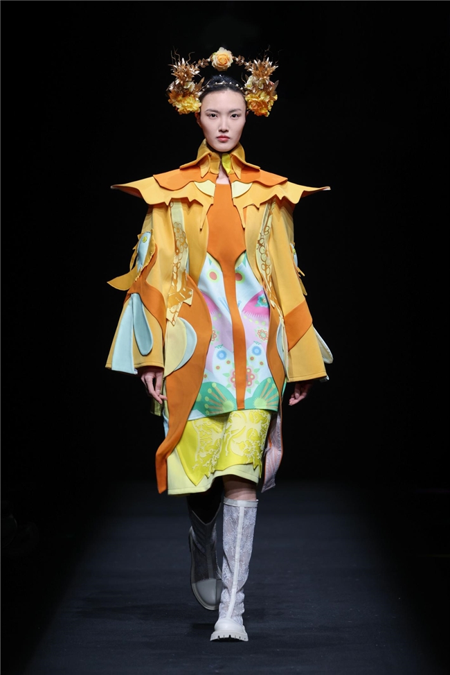 设计师刘俊廷以库淑兰彩贴剪纸与传统纸张工艺为灵感核心,将“剪、贴、衬”的民间艺术逻辑转化为服装中的结构实验。他带来的《剪韵裁春》从镂空肌理、云肩式廓形、锯齿纹样中提炼视觉元素,并借由折叠、层叠与透叠的方式探索服装塑形潜力,让平面的剪纸语言在立体衣装上获得动态生长的可能。该系列中可见披覆感较强的肩部结构、带有起伏层次的裙摆与局部镂空处理,使服装在静态中保有装饰性,在行走中又呈现出明显的节奏变化。色彩上,设计师以暖橙与明黄作为视觉焦点,呼应秋实与落日的热烈气息,再以低饱和的橘绿作基底与拼接色,形成清亮而有层次的撞色关系。不同材质的光泽差异,也进一步放大了颜色在光影中的灵动变化。