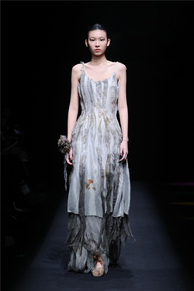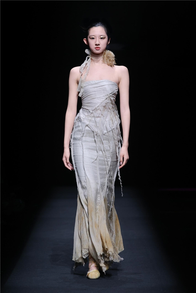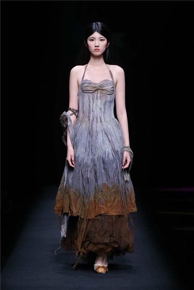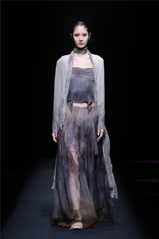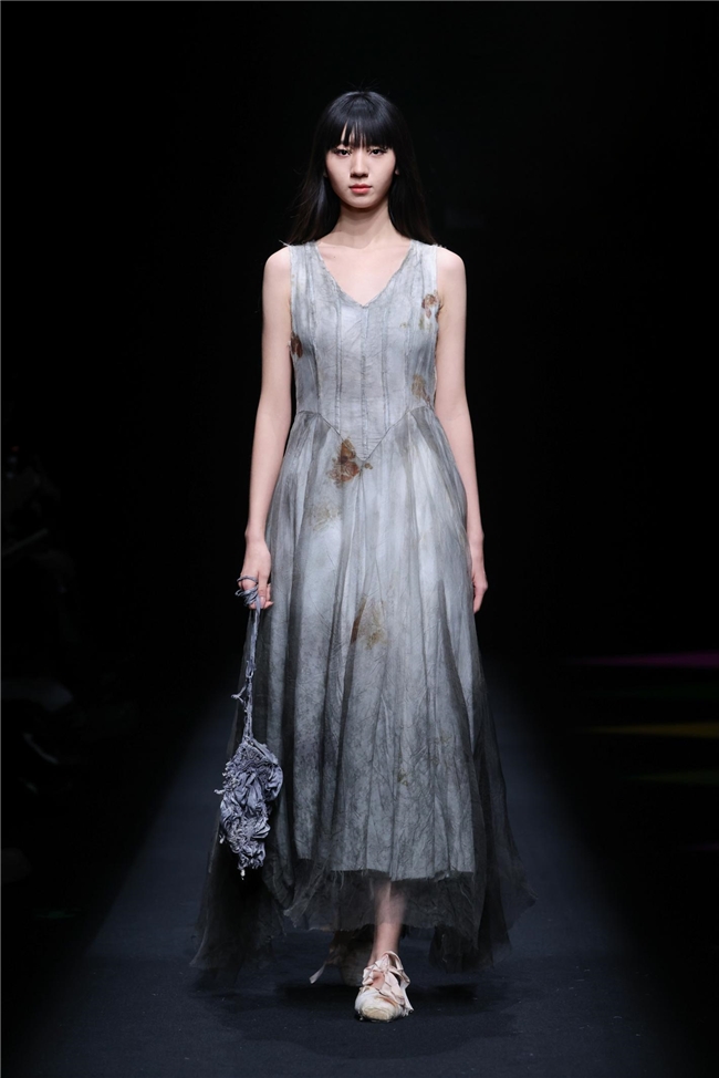 设计师魏鉴非将目光投向草本植物在风中的生长状态,以更轻、更缓的方式回应“未来”这一命题。《风起草间》采用桑蚕丝、棉麻与植物染色,保留了色晕、云斑与自然过渡。该系列更多运用不对称剪裁、自然垂坠的下摆以及带有松弛感的外层叠搭,让服装呈现出如风吹草叶般轻微摆动的节奏。色彩处理上,设计师没有选择浓烈的对比,而是更贴近草木本身的呼吸:艾草染出的灰绿、茜草染出的晚霞粉、栀子染出的月白彼此交织,使整体色调呈现出被风吹拂过的柔和层次。整组作品没有刻意制造强烈的未来符号,而是通过材料、结构与穿着状态之间的关系,传达出一种更安静、更贴近身体与自然的未来表达。
