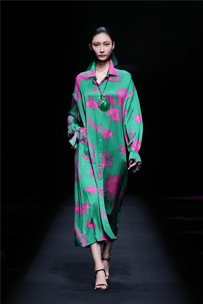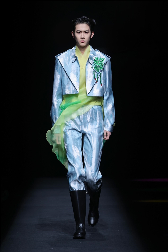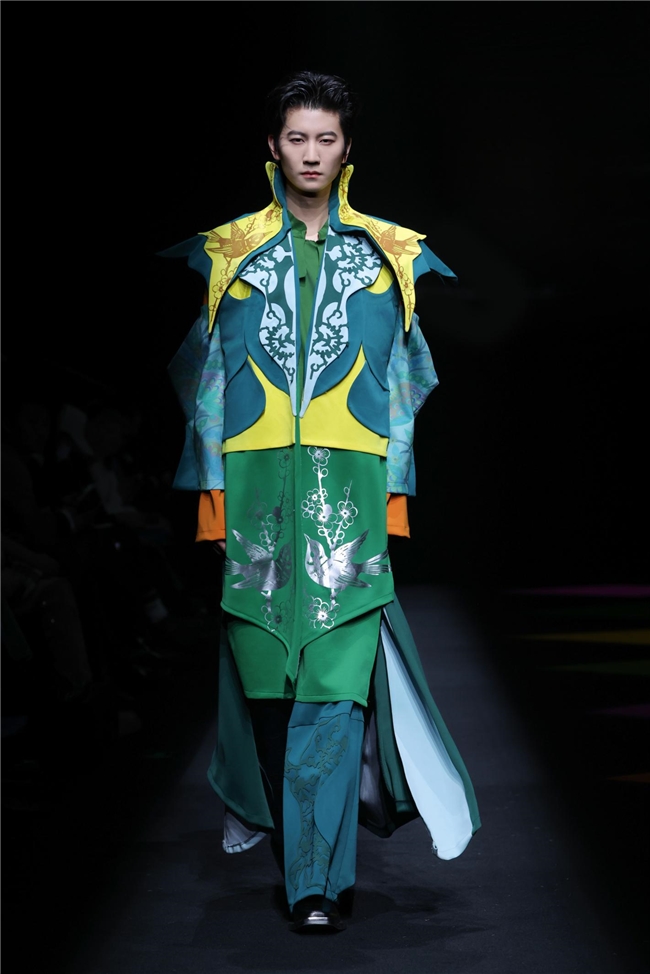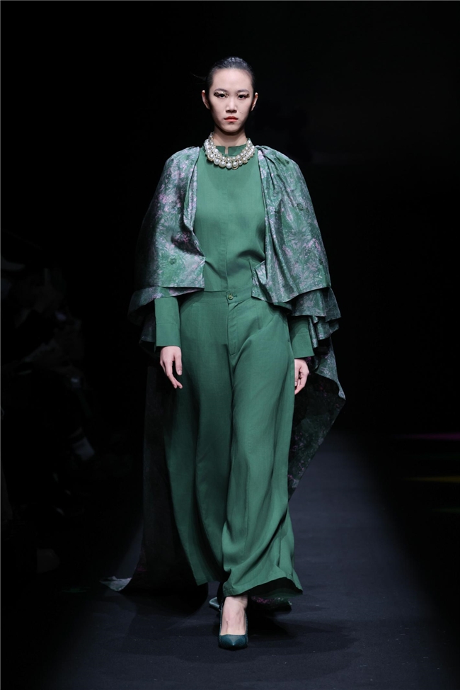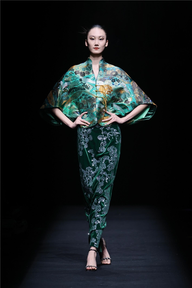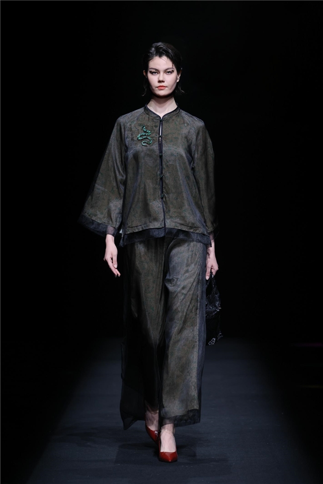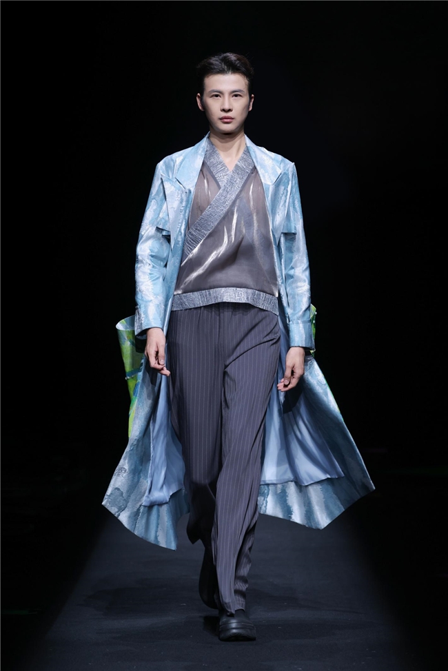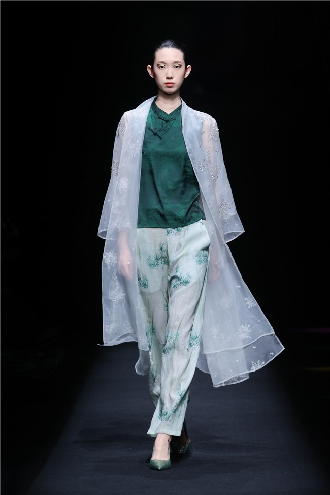 设计师张权亮以《权衡纪·衣见东方》回应“权衡自知,衣见东方”的品牌主张,将东方传统哲学中的“权衡”之道,转化为人与衣、传统与当代、仪式感与日常感之间的平衡表达。立领上衣、对襟外套、宽松长衫、披衫式叠搭与阔腿裤等单品,共同构成这一系列的核心结构,整体廓形松弛舒展,不刻意强调身体曲线。刺绣、提花、晕染等工艺被收进领口、门襟、袖口与衣摆边缘,使细节有层次却不过分张扬,既保留了东方审美的余韵,也更贴近日常穿着。色彩上,系列延展出豆绿、松绿、石青、柔粉等温润色系,并辅以茄紫、墨褐等深色作承接,使整组作品呈现出克制而丰盈的东方气质。