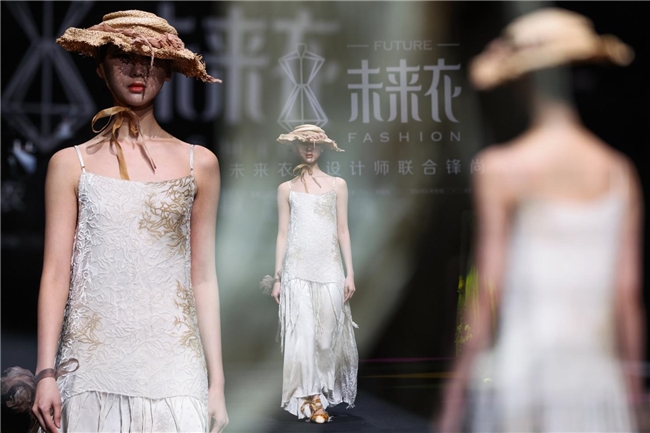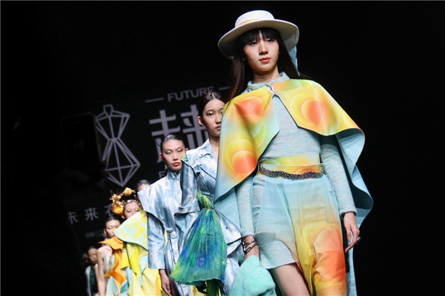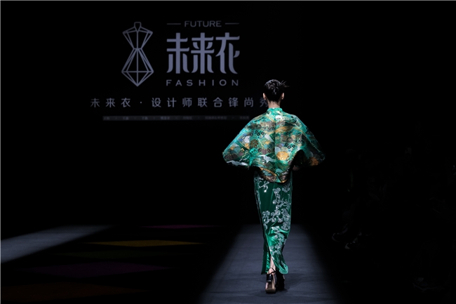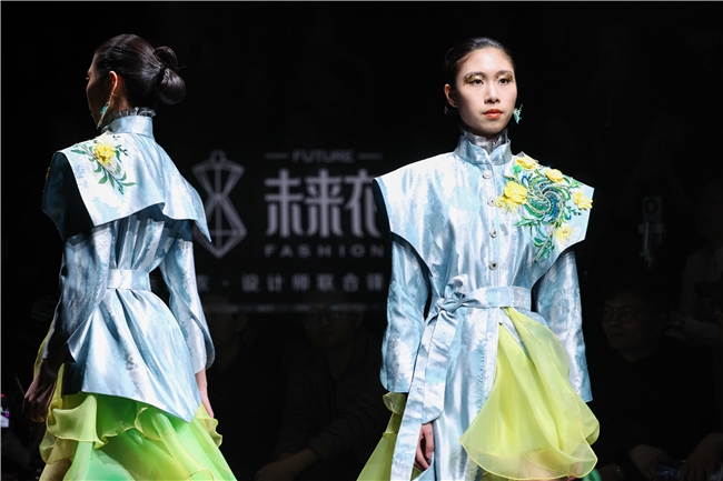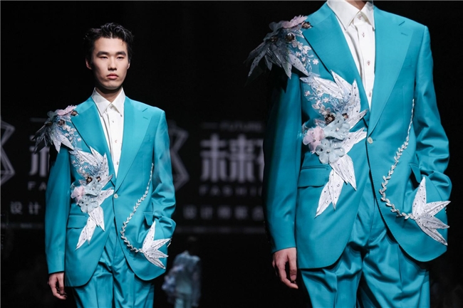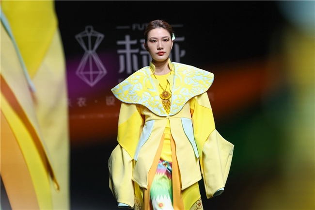 作为本次发布的重要创作主题,“橙黄橘绿”为整场秀提供了鲜明的色彩线索,也成为设计师们展开创作的灵感来源。围绕这一主题,王杨、王鑫、于鑫、魏鉴非、刘俊廷、邱雨萌&单雅超、张权亮7组设计师,以不同路径展开表达——从非遗剪纸的结构转化,到极简高定的东方气韵;从数字语境下的材质重构,到植物染色的自然表达;从点翠元素的当代转译,再到东方自然意象的写意延展,共同构成了本场发布关于“未来衣”的多元面貌。