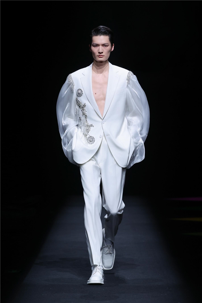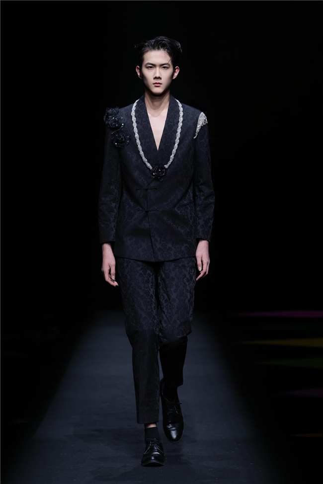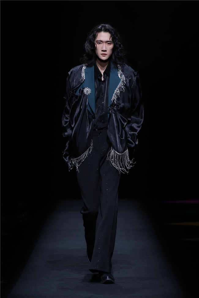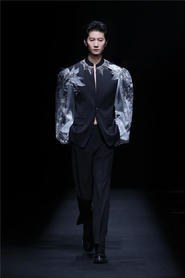 设计师邱雨萌、单雅超带来的《形意之间》,立足品牌长期坚持的极简高定方法,以精准版型、高级面料与手工工艺为支撑,在克制之中展开东方绅士着装的当代叙事。该系列没有依赖夸张的装饰,而是将重点放在比例、线条与结构之上:利落的肩线、干净的领型、修长的外套轮廓以及克制的层次处理,共同构成一种安静却有力量的穿着气场。整组作品在极简轮廓中呈现出高级质感,也让东方气韵从表象风格回到真正的服装语言之中。