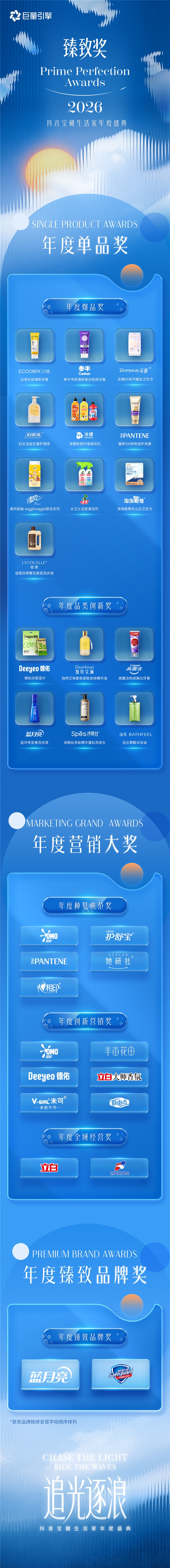 这些获奖的品牌与产品案例,共同见证着日化行业的发展方向:在营销上,全域协同,以人群情感共鸣与圈层精准渗透,击穿用户心智;在产品端,深度细分功能与场景,持续创新,精准锁定用户未被满足的需求;在品牌经营上,构建从营销到生意的全链路经营体系,持续积累品牌心智资产。