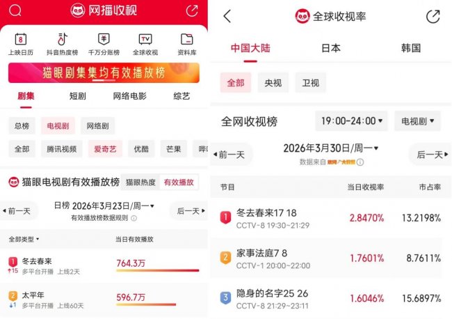 网络端方面,该剧登顶爱奇艺总榜期待榜、热搜榜、飙升榜等站内诸多榜单。猫眼端爱奇艺有效播放榜连续六天蝉联榜首,骨朵端爱奇艺电视剧榜连续三天TOP1,云合全舆情热度榜蝉联两天TOP1,Vlinkage电视剧播放指数TOP1,寻艺电视剧指数榜TOP1。