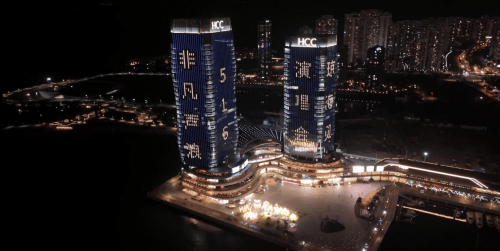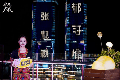 发布会在张靓颖、郁可唯等知名歌手的暖心视频祝福中拉开帷幕,她们用真挚的话语向琼海观众发出邀约;与此同时,海口湾畔的地标建筑华彩HCC两栋楼体化身巨型光影画布,“非凡声浪”、“516 琼海见”、“张靓颖 郁可唯”的字样轮番跃动,与歌手们的隔空祝福交相辉映。