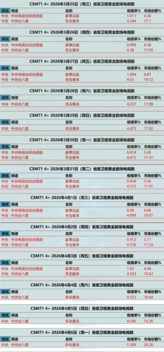 开播当日,该剧便以中国视听大数据(CVB)2.280%的收视率斩获同时段收视冠军,一举创下CCTV-8历史首日最高收视纪录。酷云实时收视率开播七分钟破2,半小时峰值达3.1687%,成为2026年央八“最快破三”的剧集。此后收视热度一路高歌猛进,中国广视索福瑞(CSM)35城收视率峰值突破5%,单集最高收视率5.857%,单集最高收视份额20.74%;CSM71城收视率峰值突破5%,单集最高收视率5.388%,单集最高收视份额20.26%,连续13天收视破4,连续15天稳居黄金档收视率榜首,以绝对优势领跑同期所有剧集。