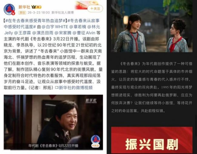 人民日报、新华社、国家广播电视总局、北京日报、央视等权威媒体与主管部门集体发声点赞,一致认可剧集的创作诚意与时代价值。媒体普遍认为,《冬去春来》跳出悬浮叙事的窠臼,以 90 年代北漂青年的奋斗群像为切口,以小见大勾勒出时代变迁的鲜活脉络,用平实克制的镜头语言书写平凡人的成长史诗,既还原了一代人的集体记忆,也为当下的现实主义创作提供了可借鉴的范本。