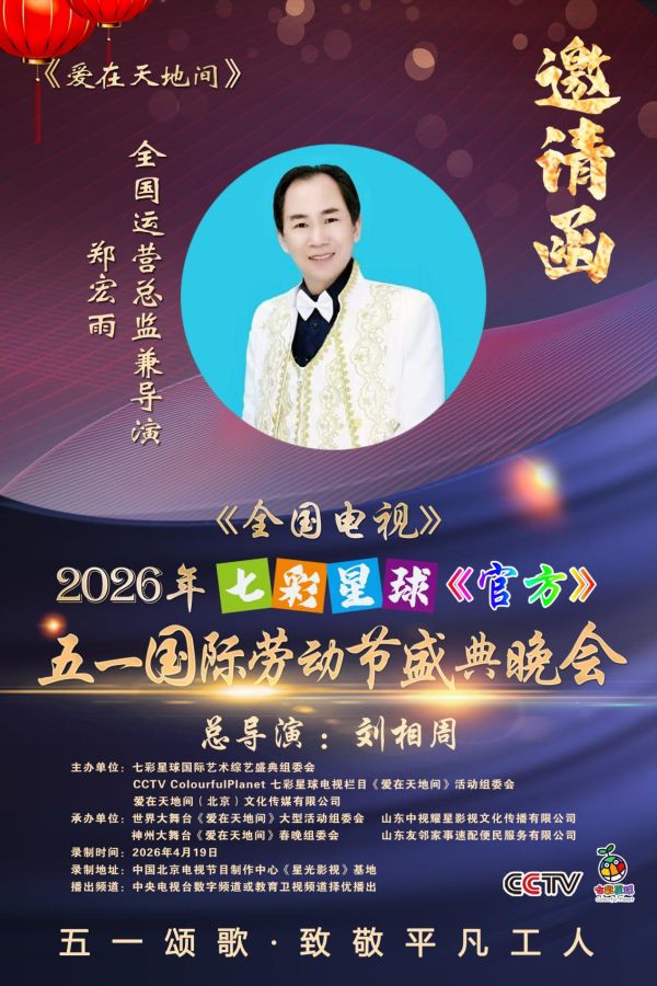 2026年1月24日,受邀参加C C T V七彩星球《爱在天地间》栏目组,举办的春节明星大联欢,郑宏雨、于文华、朱之文、杨臣刚、候丽娟、春雷等知名艺术名家,同台演出合影留念!郑宏雨登台表演的《好运来》,荣获朱之文老师颁发的金奖!