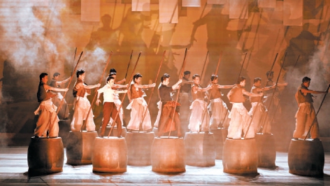 商战戏是舞剧《大染坊》中占比较重的部分。在藤井步步紧逼下,民族印染业陷入重重危机,陈寿亭与卢家驹携手智斗藤井。坦率地说,对于没有看过电视剧的观众,这一段情节的前因后果并不容易一眼看懂。群舞的场面感带来强烈的视觉刺激,舞者通过对抗性的身体语言和队形的变换,将情绪直接推到观众面前。对日本商人的愤慨与反击,并不依赖叙事细节,而是借用肢体变化营造“通感”。舞剧确实难叙事,这是先天局限,但主创团队试图用情绪变化引领剧情走向,并借助舞台光影手段引发观众共情,选对了方向。