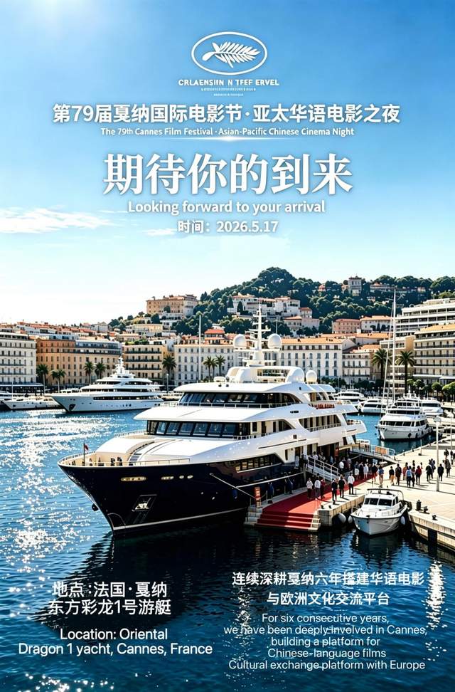 亚太华语电影之夜将在第79届戛纳国际电影节举办期间(5月17日),地点:戛纳码头的东方彩龙1号游艇。由唐影集团联合亚太影展、澳门电影协会、欧洲华人电影工会,辰鸣腾世(北京)文化传媒有限公司,深圳市智赢文创传媒有限公司共同主办,连续六年深耕戛纳,搭建亚太与欧洲华语影视交流桥梁。