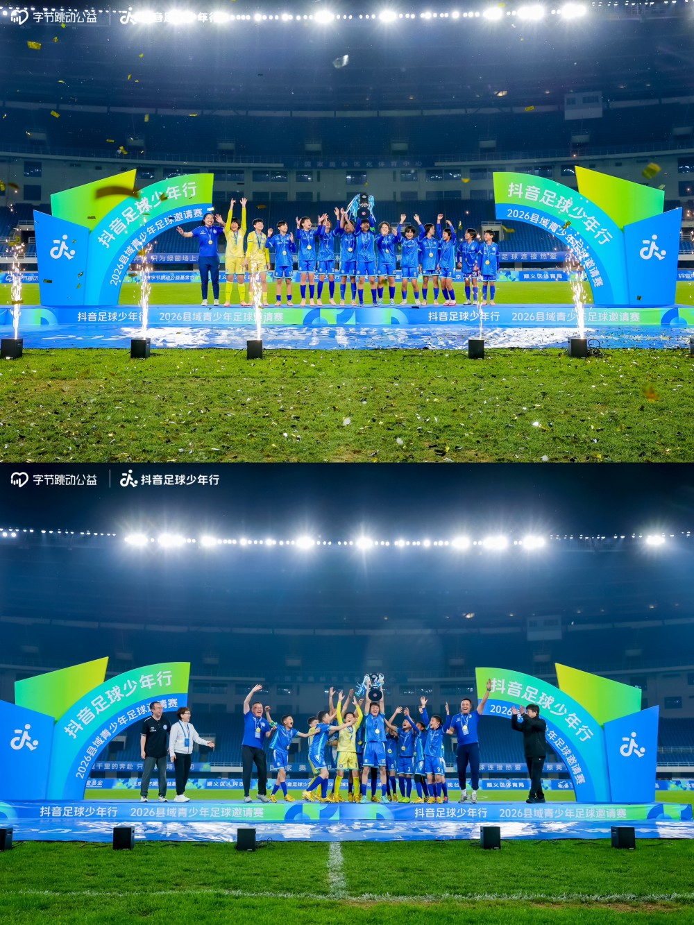 4月18日,“抖音足球少年行·2026县域青少年足球邀请赛”在北京国家奥林匹克体育中心落幕,来自全国30个县(市)的56支U12青少年足球队参赛。历经11天角逐,海南省琼中黎族苗族自治县女子代表队、新疆维吾尔自治区喀什地区莎车县男子代表队分别获得女子组、男子组冠军。本次比赛由北京市顺义区人民政府支持,北京广播电视台、北京字节跳动公益基金会联合主办,北京市顺义区体育局协办,深圳壹基金公益基金会、中国乡村发展基金会合作举办。