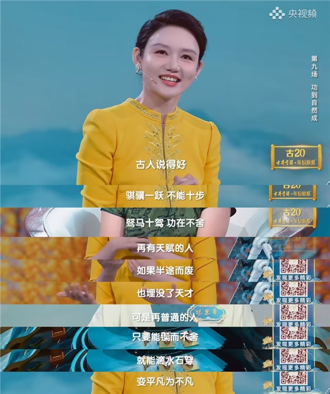 在诗词大会的节目呈现中,每一期都会围绕当期诗意主题,结合诗词典故品读古诗。其中龙洋对 “功到自然成” 的一番阐述,令很多观众共鸣戳心。““骐骥一跃,不能十步;驽马十驾,功在不舍。”再有天赋的人,如果半途而废,也埋没了天才;可是再普通的人,只要锲而不舍,就能滴水石穿,变平凡为不凡。”被很多网友直呼,这是龙洋自我心声的流露,是她六年诗词大会主持的真实写照,也是她人生观、价值观的缩影。