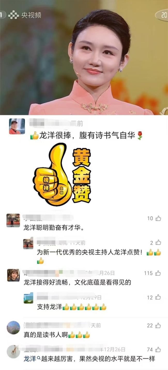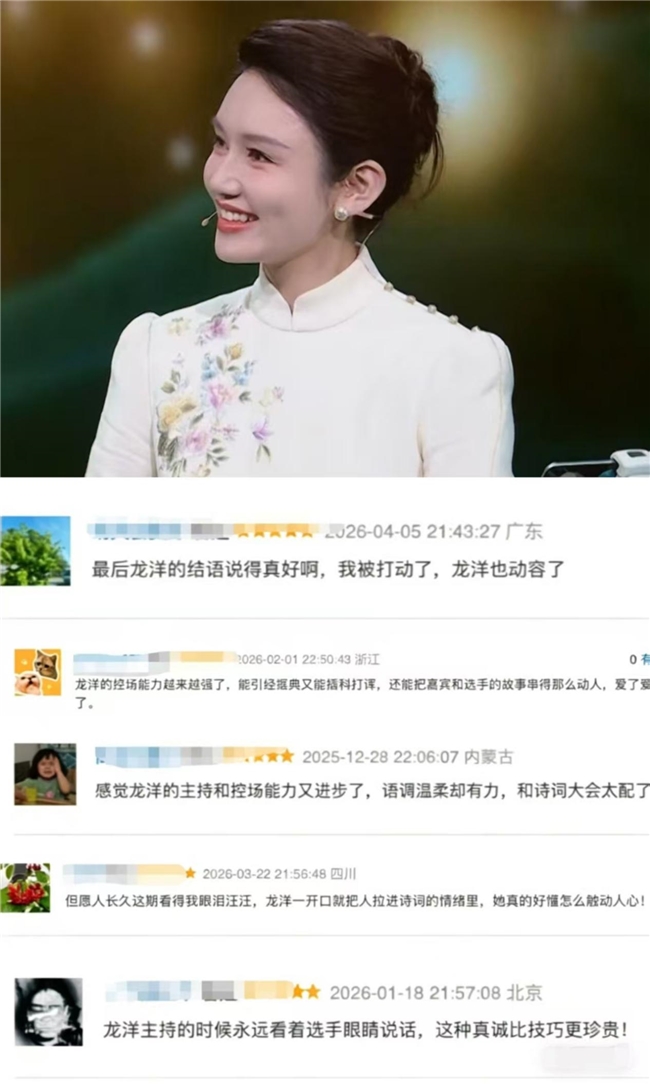 有人夸她控场能力强了,能引经据典也能插科打诨;有人说她跟嘉宾老师和选手的互动越来越默契,整个舞台氛围被她拉得满满;还有人说,龙洋最大的变化,是她的眼睛里有了更多故事,真正在跟诗词、跟人对话。